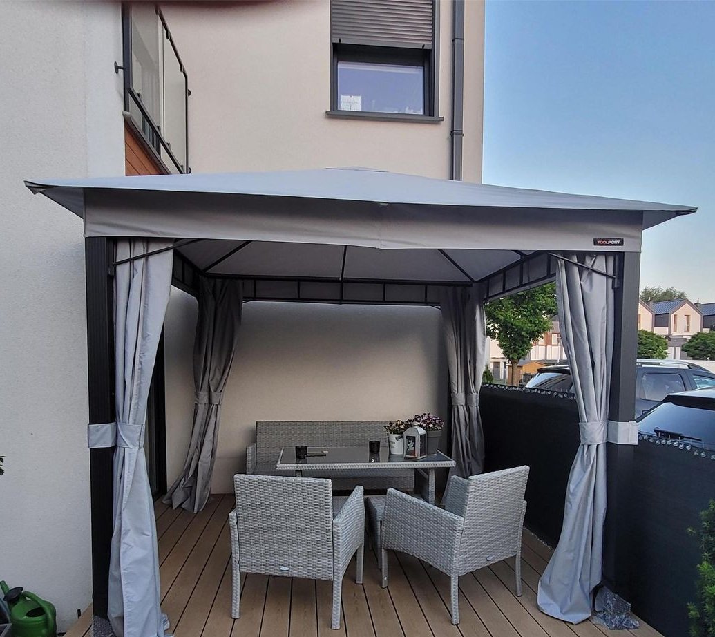 Taras wykonano z trwałej deski kompozytowej. Na tarasie zamontowano pergolę wyposażoną z zadaszenie oraz zasłony, które dają schronienie przed słońcem oraz poczucie przytulności – elementy wykonane z materiału są łatwe w demontażu, co jest dużą zaletą w okresie jesienno-zimowym.