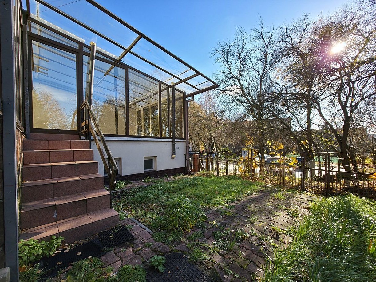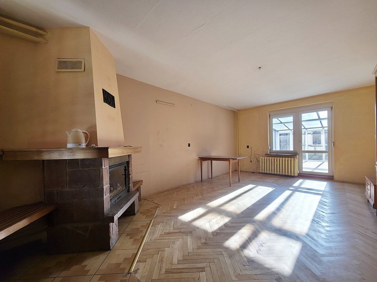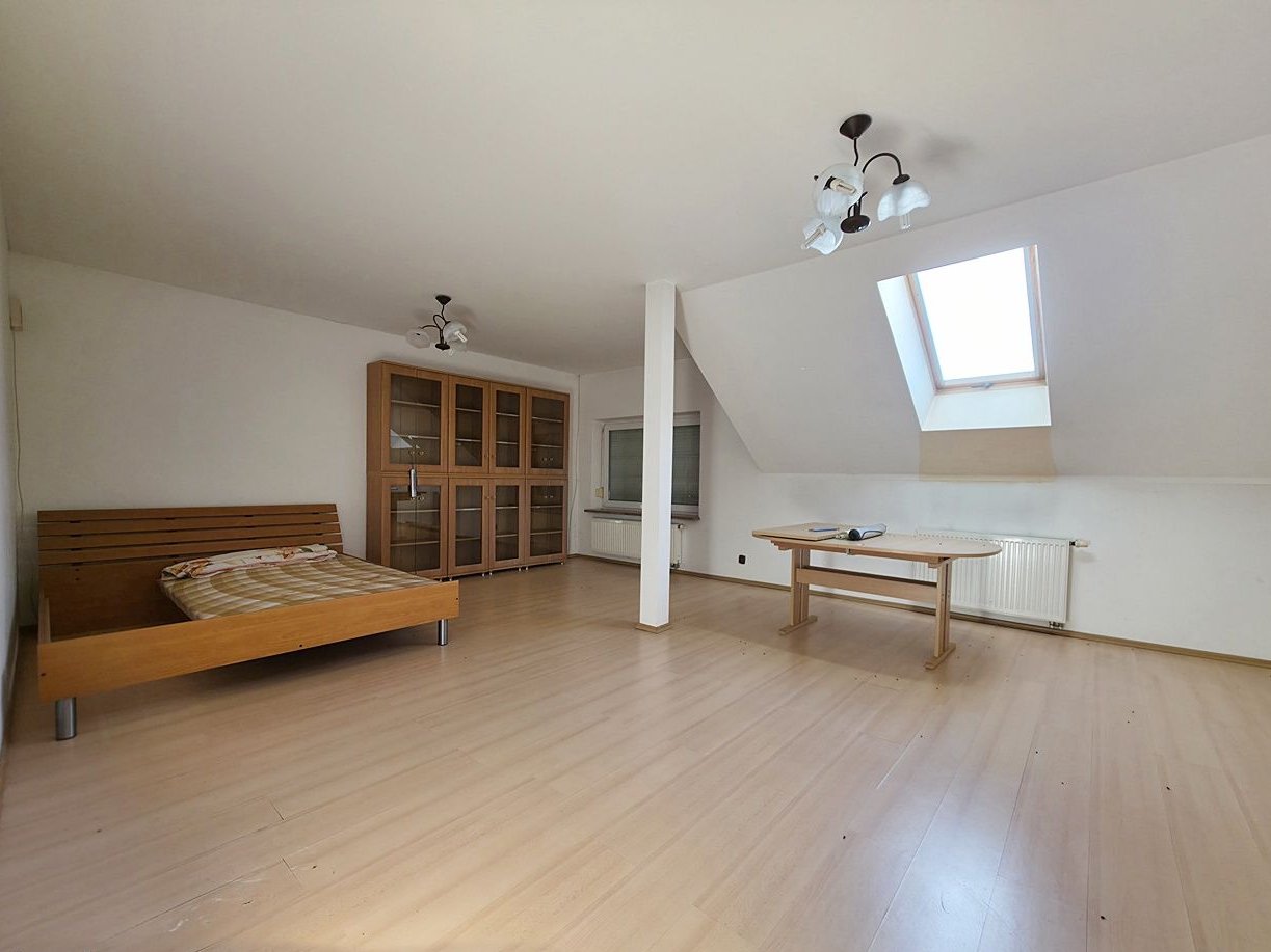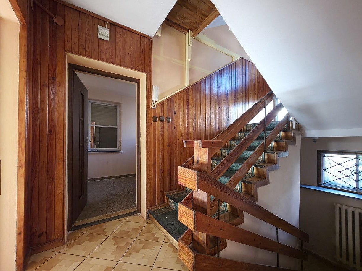 Nieruchomość częściowo podpiwniczona. Na parterze znajduję się salon, sypialnia, oddzielna kuchnia oraz WC. Na pierwszym piętrze natomiast ulokowane zostały 3 sypialnie. Dodatkowo przystosowano do zamieszkania poddasze, na którym znajduje się spora przestrzeń w postaci sypialni, a także oddzielna wnękowa kuchnia, oraz łazienka z WC. Budynek w stanie do odświeżenia, dach dwuspadowy pokryty blachodachówką. Atutem nieruchomości jest jej rozkład, umożliwiający przystosowanie nieruchomości pod wynajem pokoi, a także garaż w bryle budynku. Teren wokół został w całości ogrodzony.