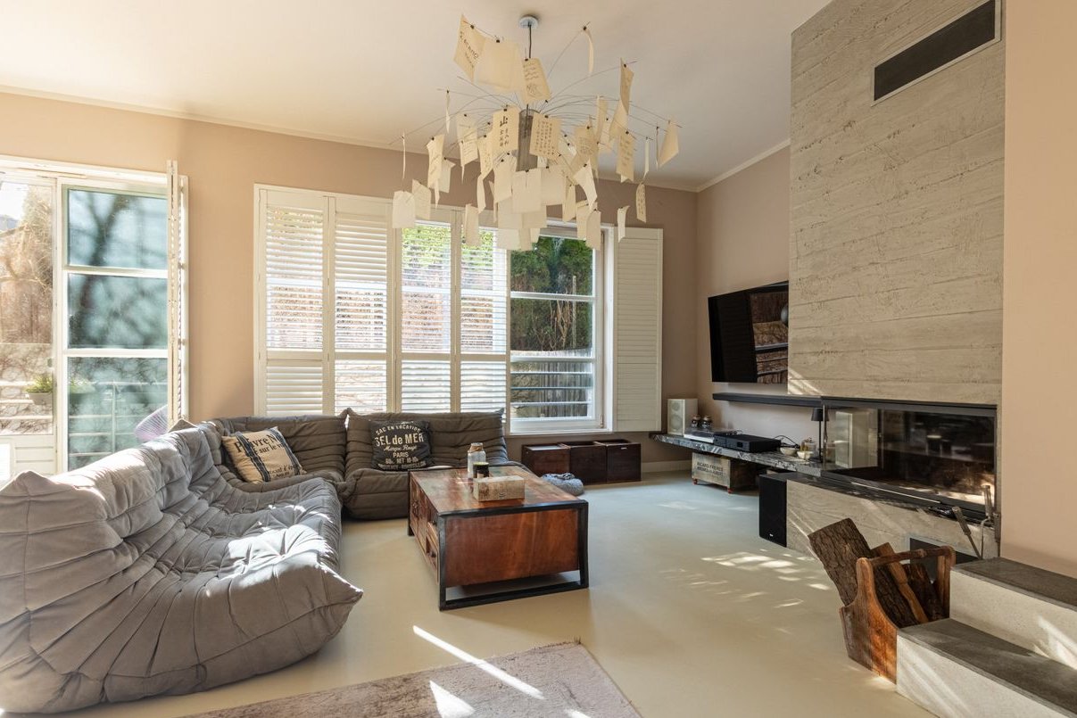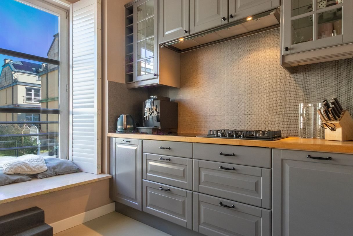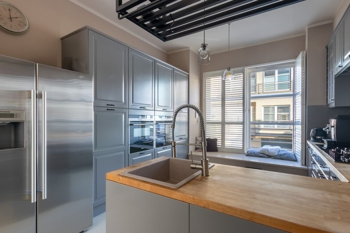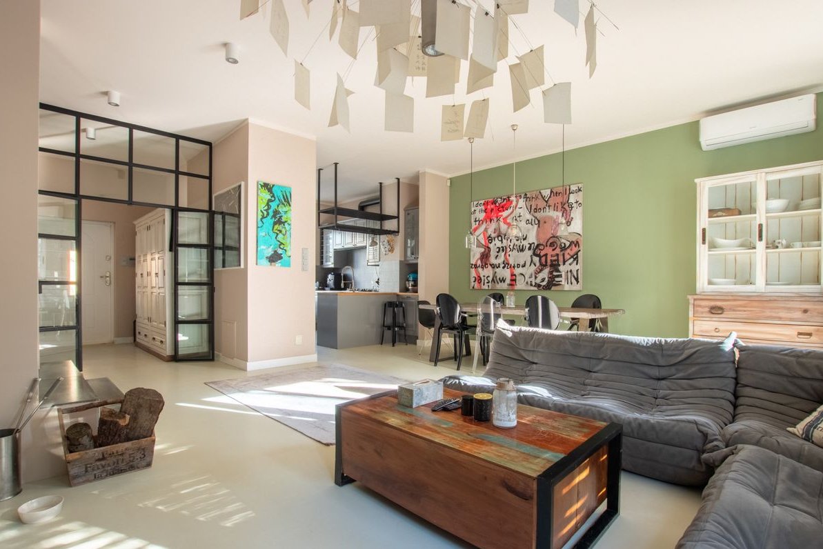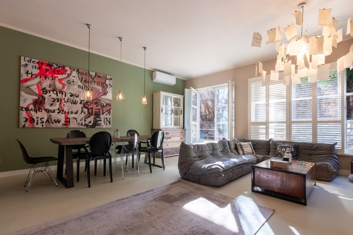 Otwarta przestrzeń o powierzchni około 50 m² zachwyca swoją funkcjonalnością i elegancją. Dzięki panoramicznym oknom wnętrze jest pełne naturalnego światła, co podkreśla jego wyjątkowy charakter i sprawia, że jest idealnym miejscem zarówno do relaksu, jak i spotkań z bliskimi. W części wypoczynkowej znajduje się kanapa i stolik kawowy. Obok umieszczono duży stół z krzesłami, który świetnie sprawdzi się podczas wspólnych posiłków.