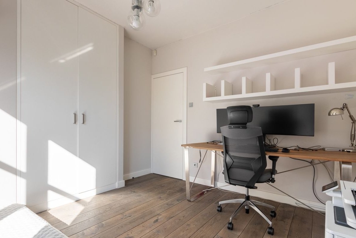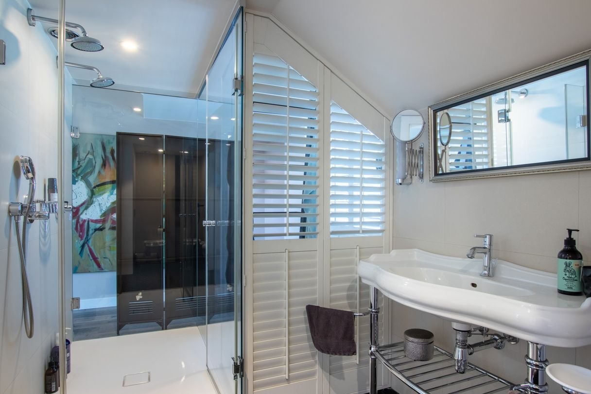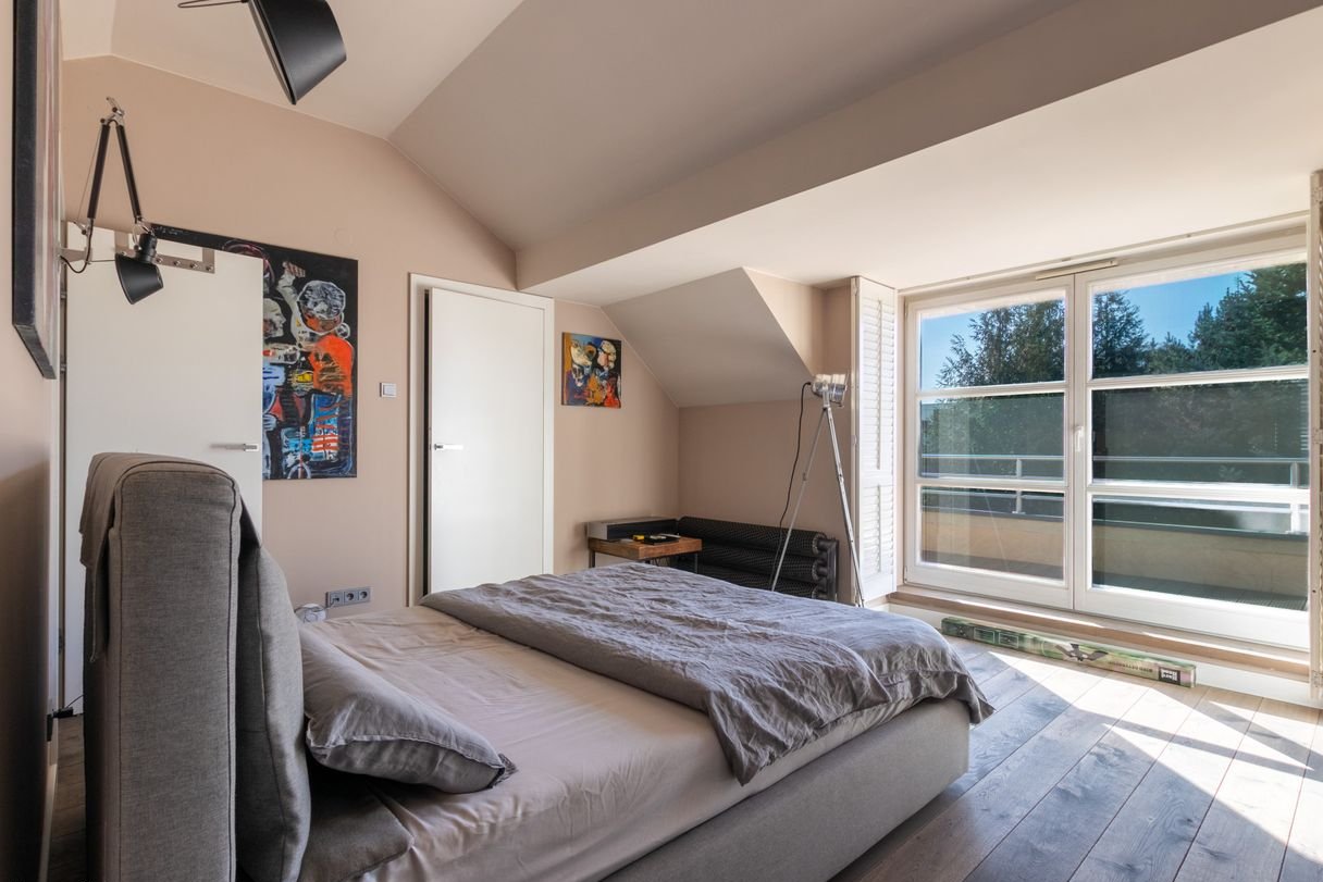 Główna sypialnia na całym poziomie o powierzchni około 22 m² to wyjątkowo jasne i przestronne pomieszczenie, które zapewnia komfort oraz funkcjonalność. Na piętrze zlokalizowana jest także przeszklona łazienka z prysznicem. Dzięki dużym panoramicznym oknom na dwóch ścianach wnętrze jest doskonale doświetlone naturalnym światłem przez cały dzień. Z sypialni bezpośrednie wejście do garderoby. Dodatkowym atutem jest bezpośrednie wyjście na dwa tarasy, które pozwala cieszyć się świeżym powietrzem o każdej porze dnia.