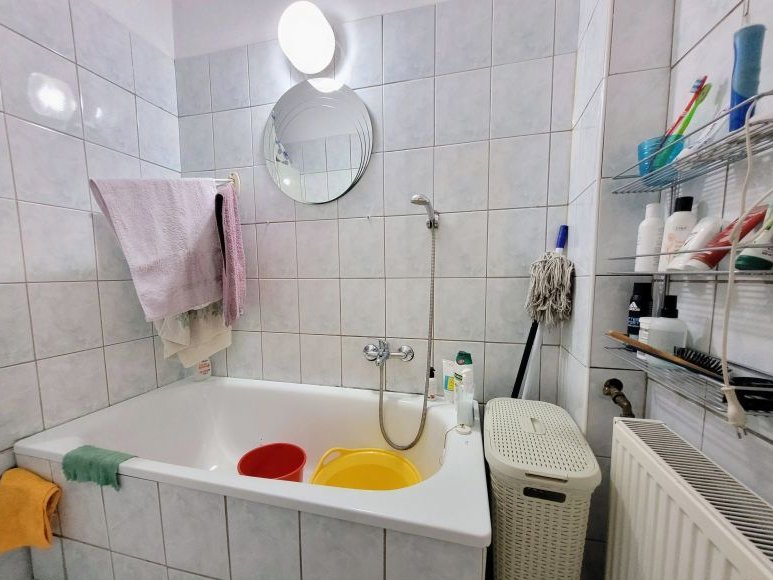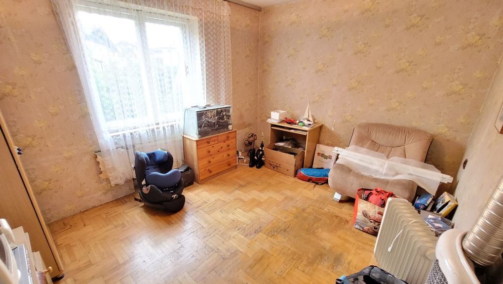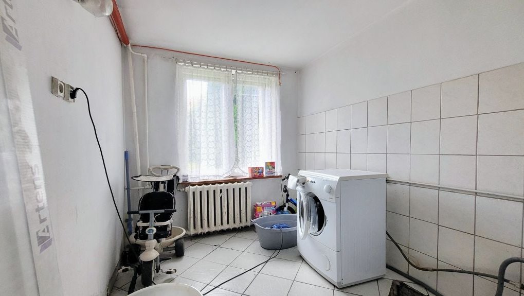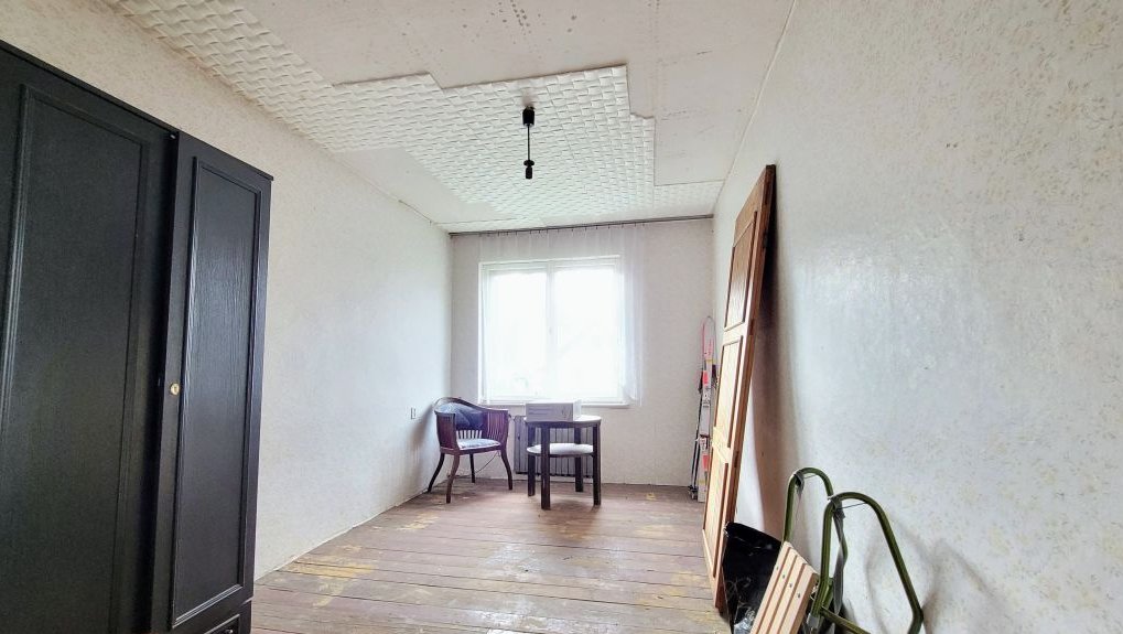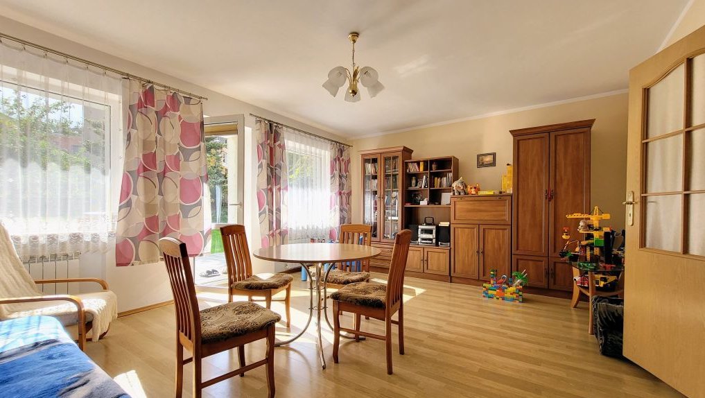 W domu można spokojnie zamieszkać na parterze, na którym znajduje się salon z wyjściem na taras i do ogrodu, sypialnia, kuchnia, łazienka z wanną, toaleta oraz przedpokój. Na tym poziomie okna zostały wymienione na plastikowe, ciepła woda pozyskiwana jest z junkersa gazowego, a centralne ogrzewanie jest z pieca w przyziemiu na paliwo stałe. Ta część nieruchomości jest zadbana i w dobrym stanie, więc można w niej od razu zamieszkać i powoli remontować resztę pomieszczeń.