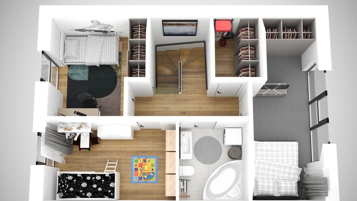 Wewnątrz przestronny salon z kuchnią, biuro, 3 sypialnie, garderoba oraz spory strych. Duże przeszklenia i brak skosów zapewnią dobre nasłonecznienie i lepsze samopoczucie.