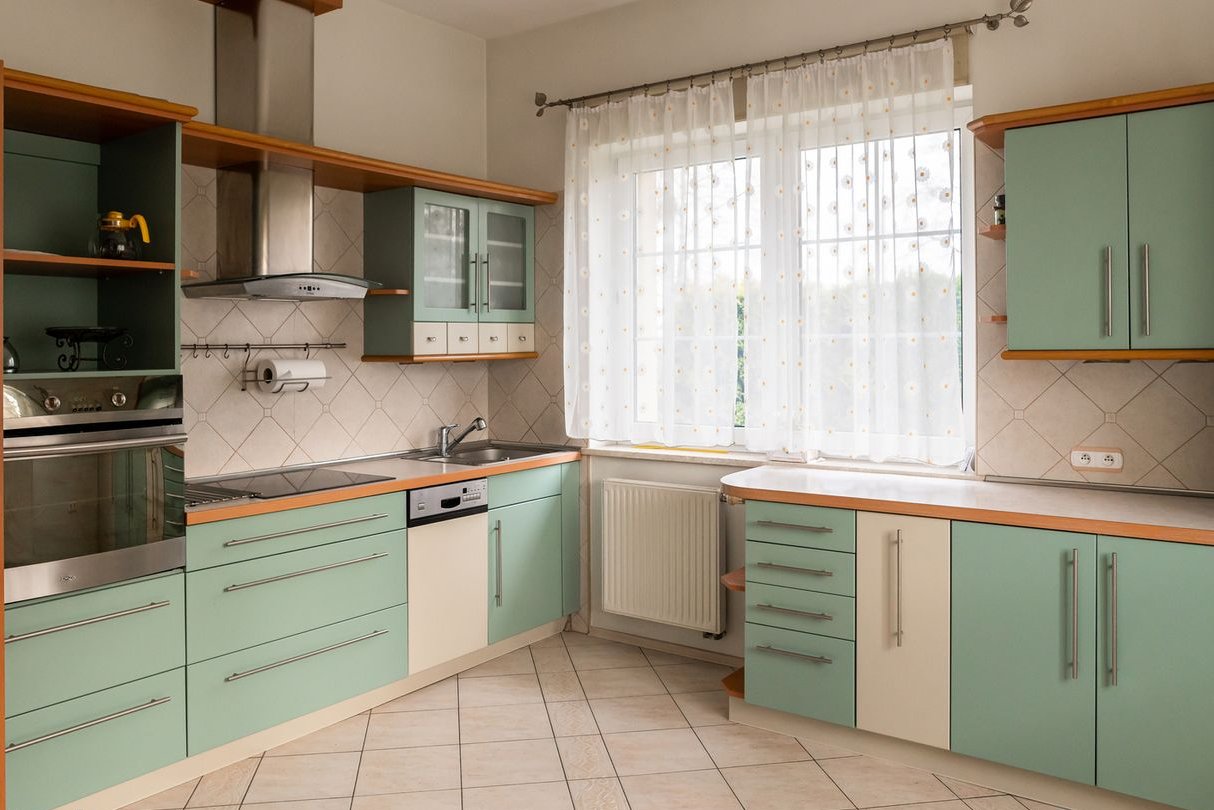 Kuchnię wyposażono w zabudowę na wymiar, płytę ceramiczną dużą, zabudowaną lodówkę z zamrażarką, zmywarkę oraz piekarnik z wygodnym dostępem.