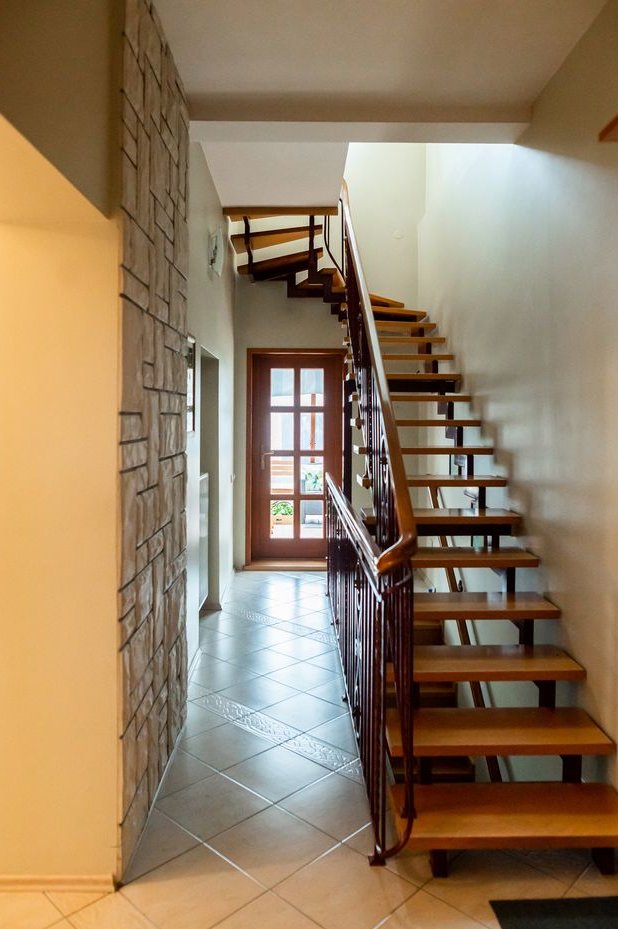 Wygodne, drewniane schody na piętro z kutymi balustradami.