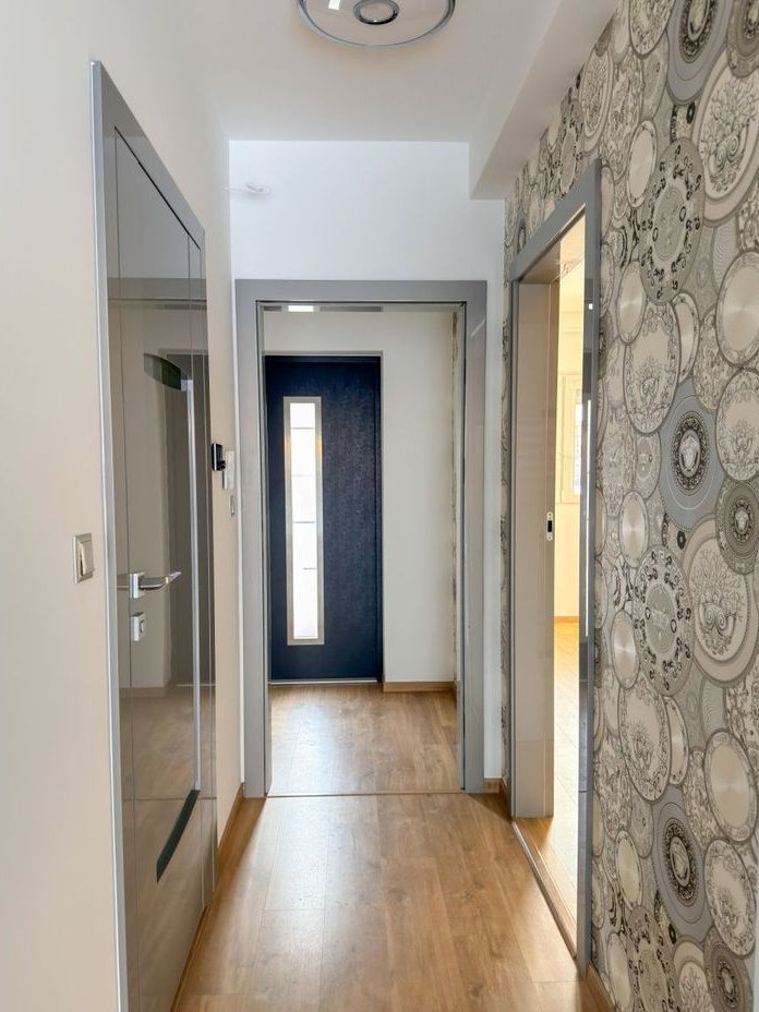 Na podłogach panele, w przedpokoju i łazienkach flizy.