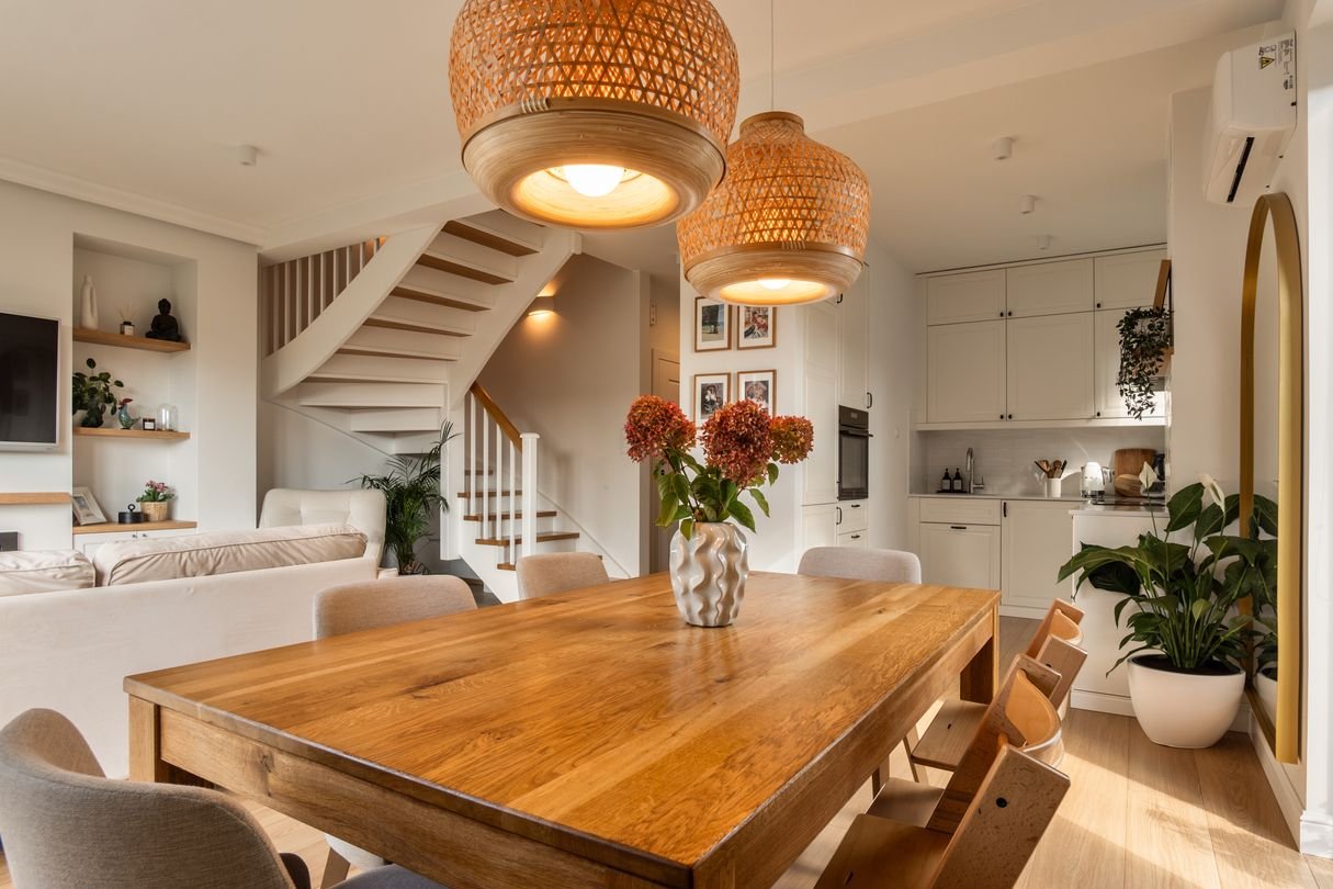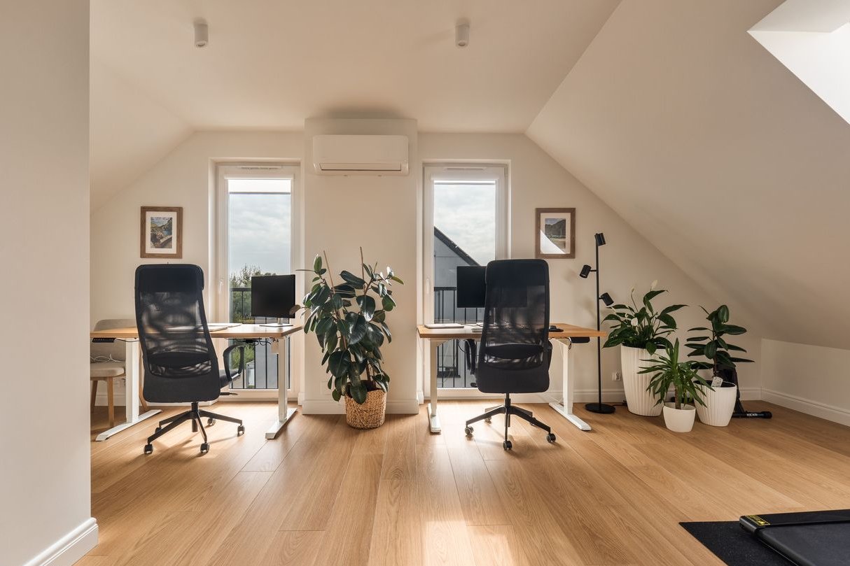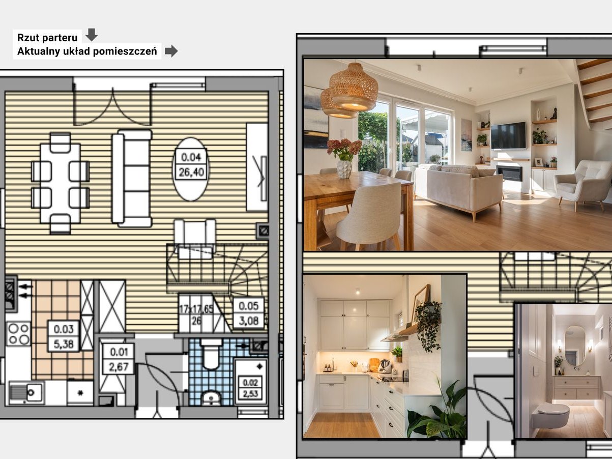 Trzy poziomy z funkcjonalnym podziałem (parter - strefa dzienna, piętro - sypialnie + łazienka, poddasze - praca + strefa relaksu).