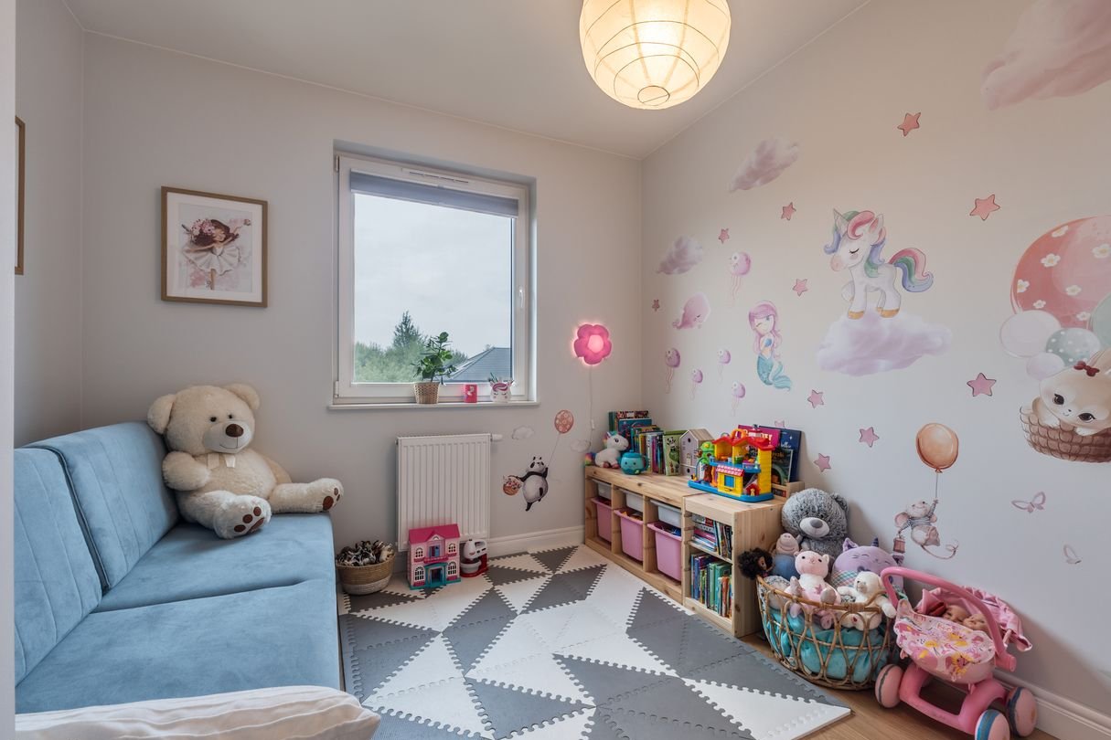 piętro, które stanowi strefę prywatną (duża sypialnia z garderobą, 2 sypialnie dla dzieci, łazienka). Wysokość pomieszczeń 2,6 m.
