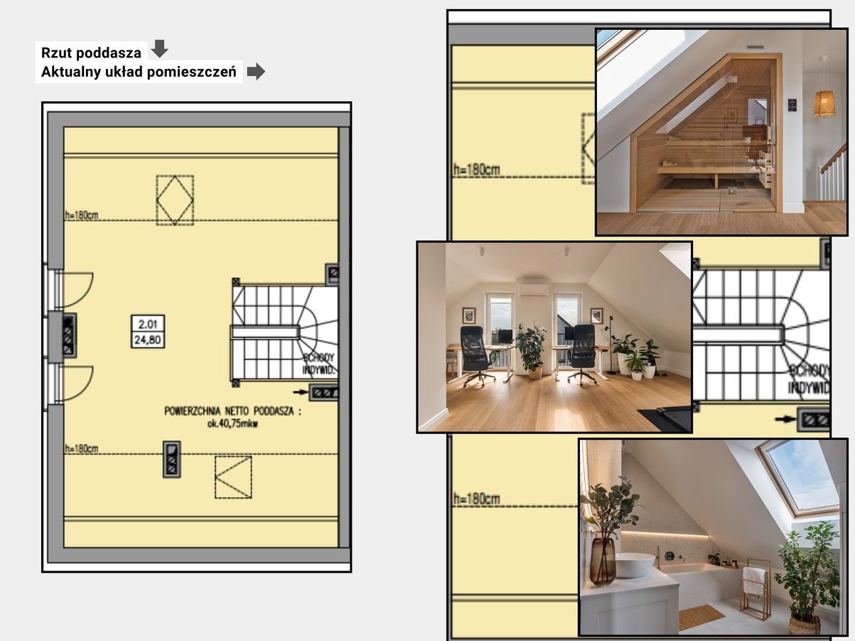 poddasze, które obecnie jest miejscem pracy oraz relaksu (sauna, łazienka, dużo miejsca na bieżnie, trenażer itd.). Wysokość pomieszczeń 2,6 m.