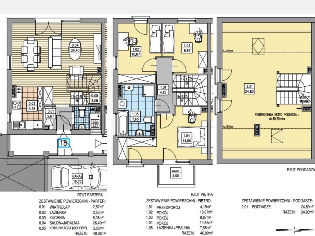 Dokładne wymiary oraz układ pomieszczeń na jednym ze zdjęć (stan pierwotny widoczny na rzutach minimalnie różni się od stanu faktycznego, np. na poddaszu wydzielono dodatkową łazienkę).