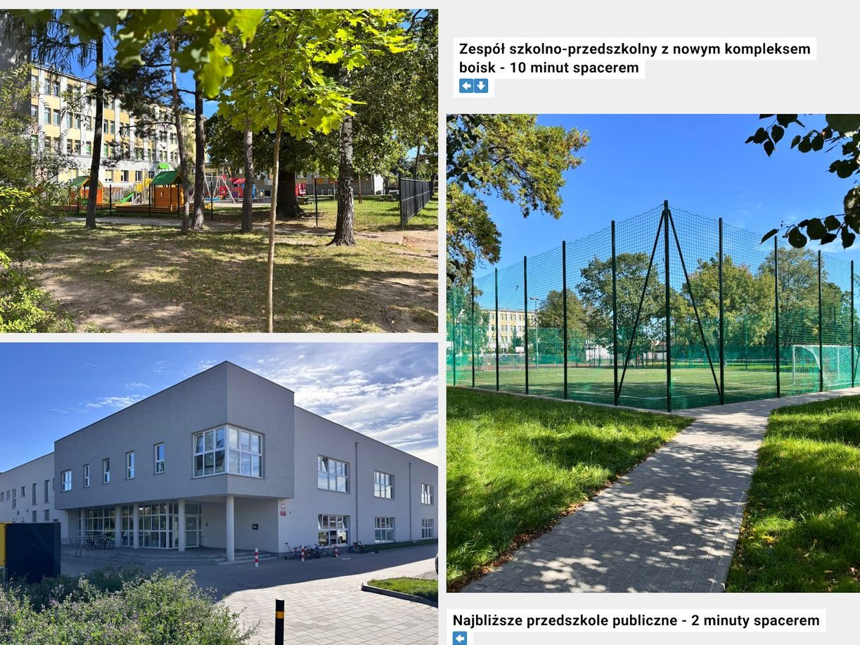 Lokalizacja dobra dla rodzin z dziećmi. W tej konkretnej inwestycji stanowią one prawie 100% mieszkańców. Bardzo blisko przedszkole (2 minuty spacerem), szkoła (10 minut spacerem), park (10 minut spacerem). Lokalne i spokojne ulice zachęcają do przemieszczania się rowerem (o czym świadczy ilość rowerów przed przedszkolem i szkołą).