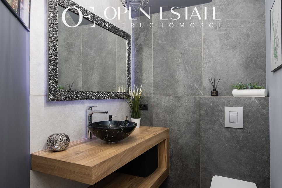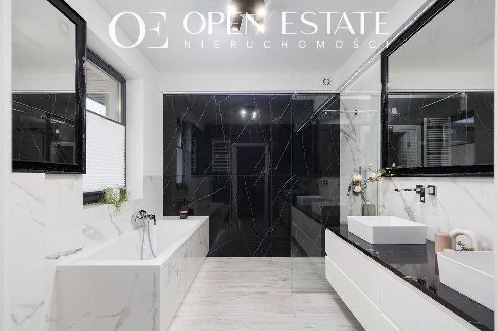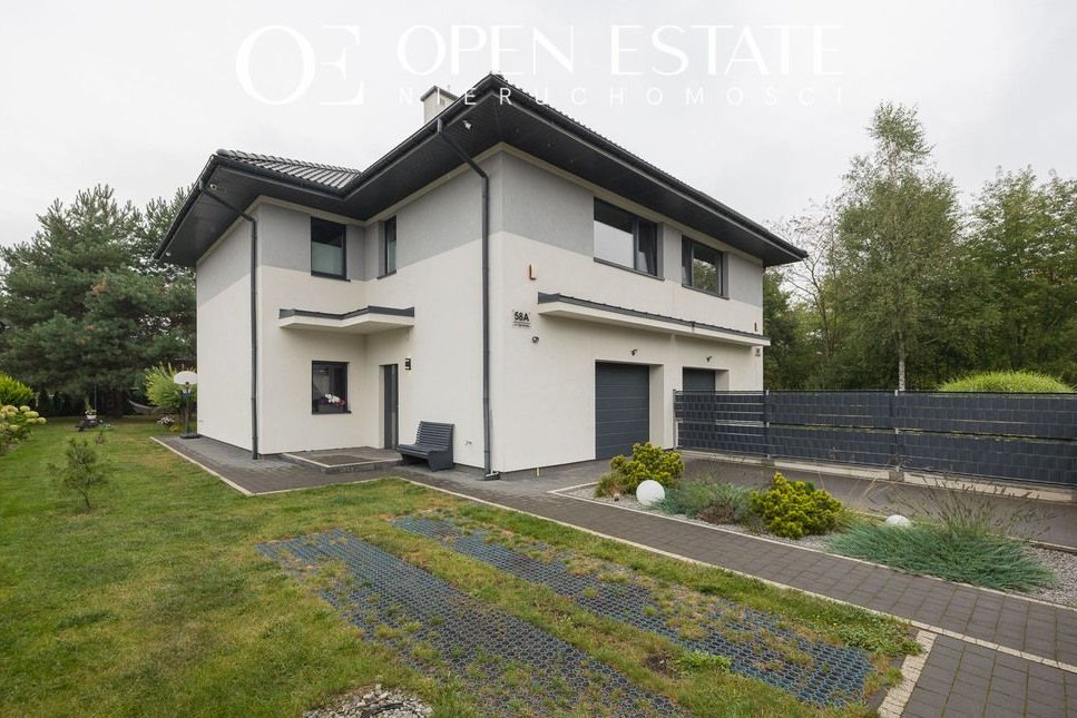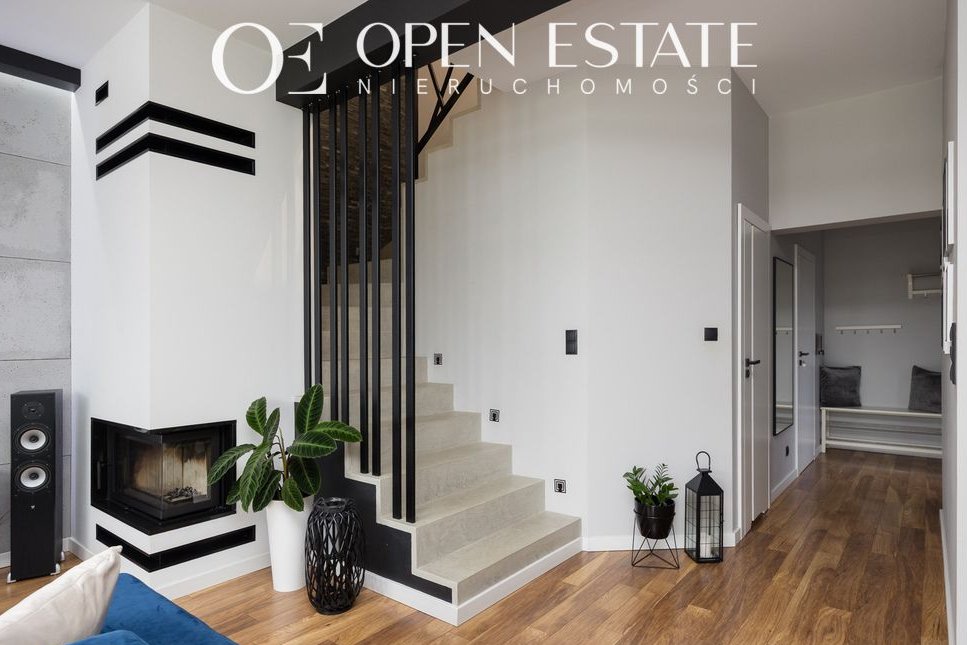 Dom posiada dwa poziomy oraz poddasze, ogrzewanie gazowe, kominek i pełne media. Wysokie pomieszczenia (2,92 m na parterze i 2,63 m na piętrze) dają poczucie przestrzeni. W kuchni i łazienkach zastosowano blaty kamienne, a na podłogach panele i gres.