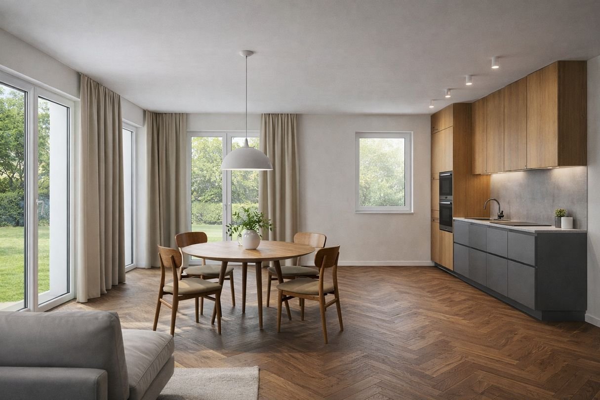 Przestronny salon z aneksem kuchennym – serce domu z dużą ilością naturalnego światła