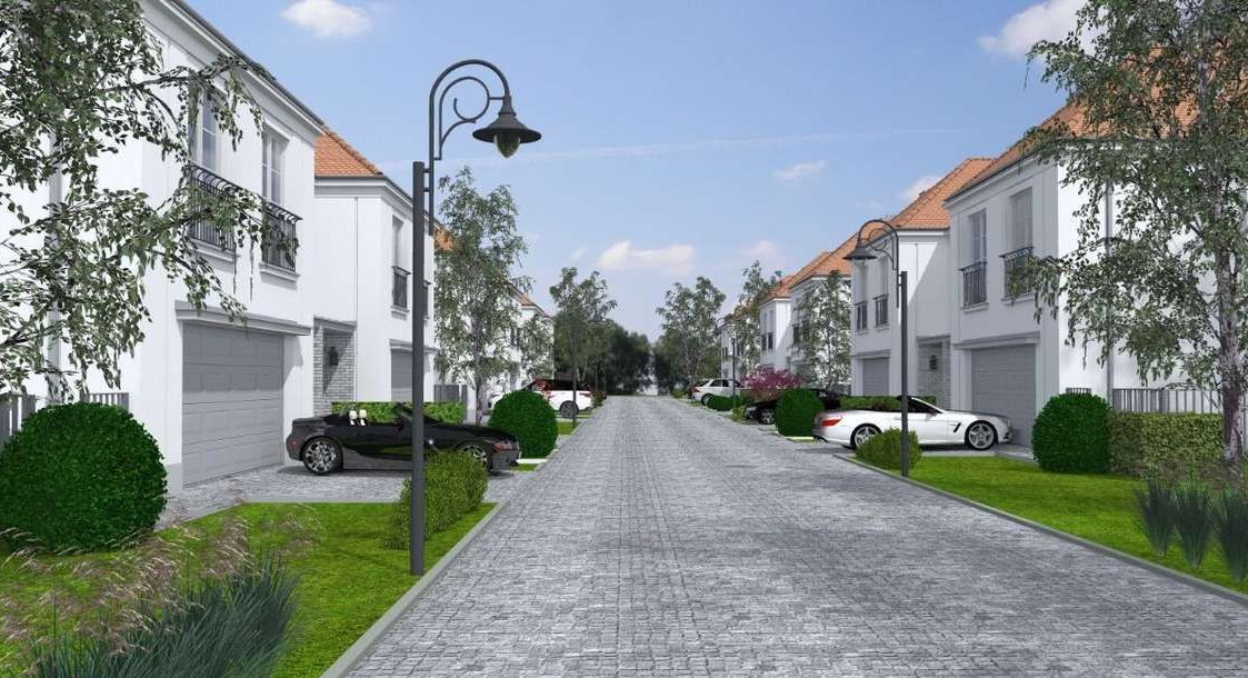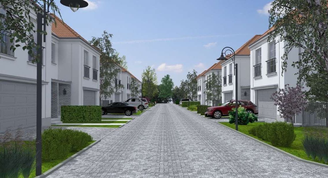Nowoczesna infrastruktura osiedla – drogi i podjazdy z kostki brukowej, stylowe oświetlenie, ogrodzenie z bramą na pilota