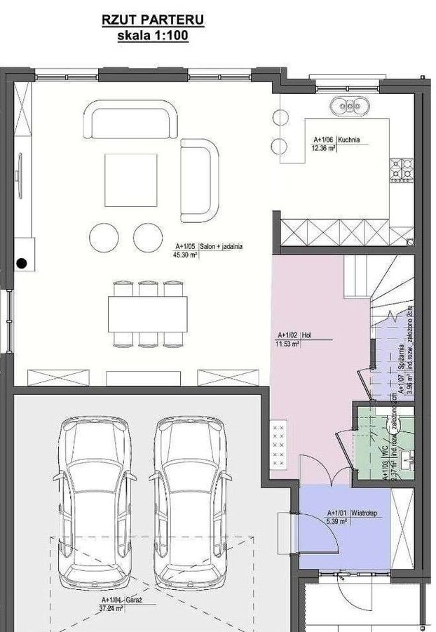 Parter: Przestronny salon, jadalnia, kuchnia, spiżarnia, reprezentacyjny hall, kotłownia oraz garaż na dwa auta.