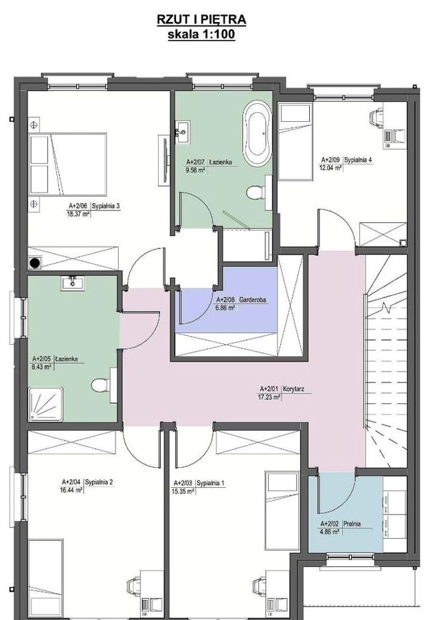 Piętro: 4 sypialnie (w tym master bedroom z prywatną łazienką i garderobą), 2 łazienki z oknem, pralnia oraz dodatkowa garderoba.