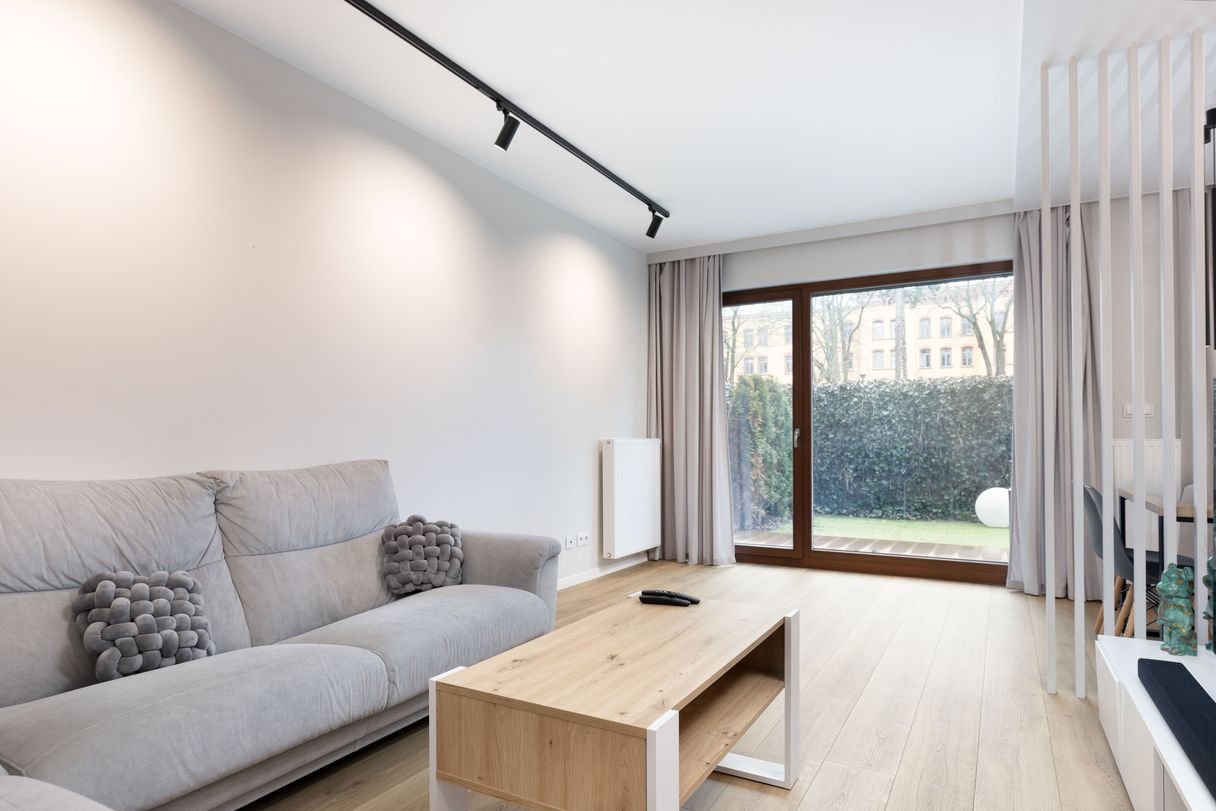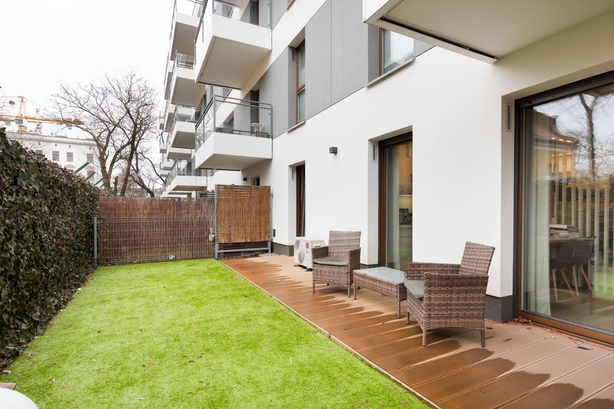Jest to klimatyzowany apartament, w pełni umeblowany i wyposażony (również w AGD). Posiada przypisane miejsce w hali garażowej. Z salonu, kuchni i sypialni jest wyjście na taras i ogródek. Strona zachodnia.