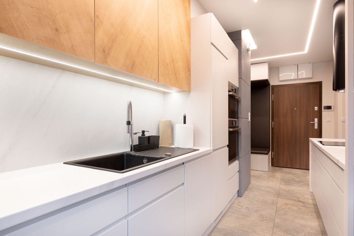 narożnik, szafka pod TV, oświetlenie sufitowe, na podłodze deska barlinecka