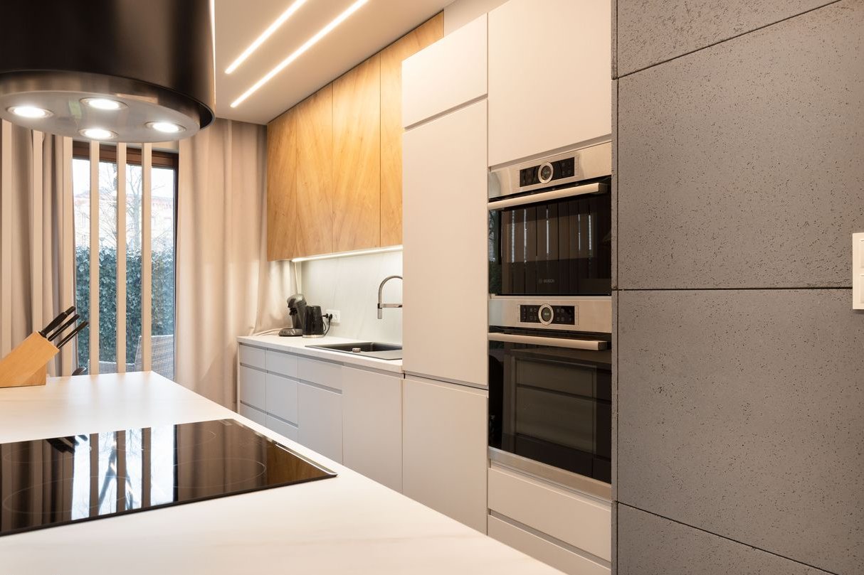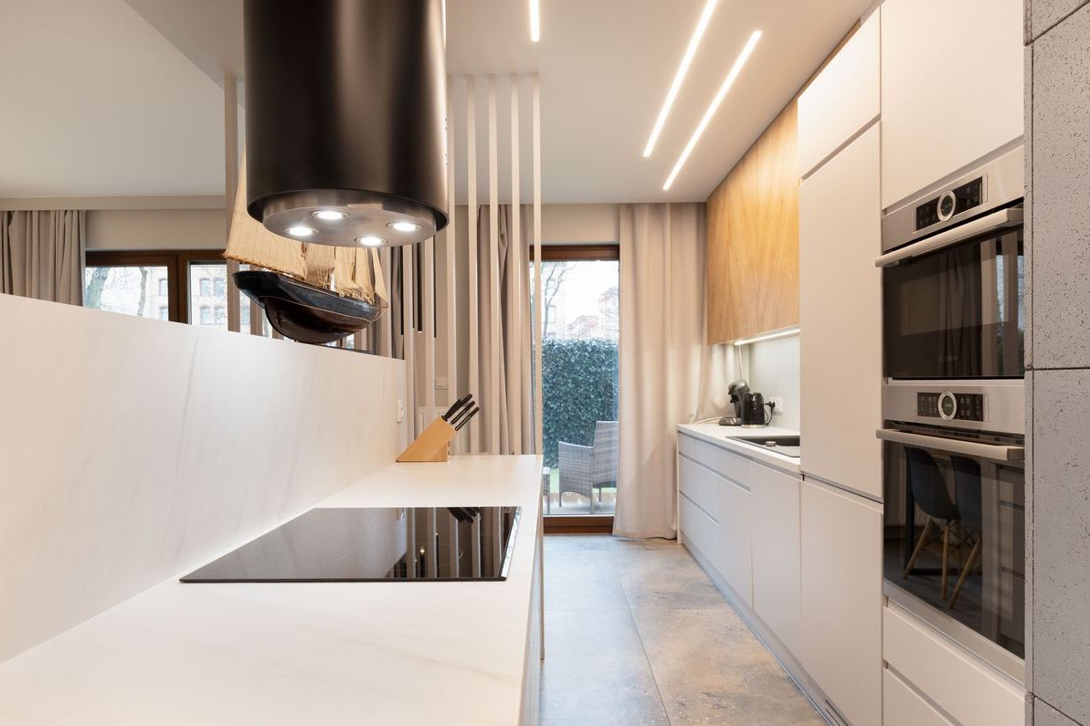 Aneks kuchenny z wydzieloną wyspą, stołem i krzesłami, pełne AGD: lodówka, piekarnik i kuchenka mikrofalowa w zabudowie, po za tym płyta indukcyjna i okap.