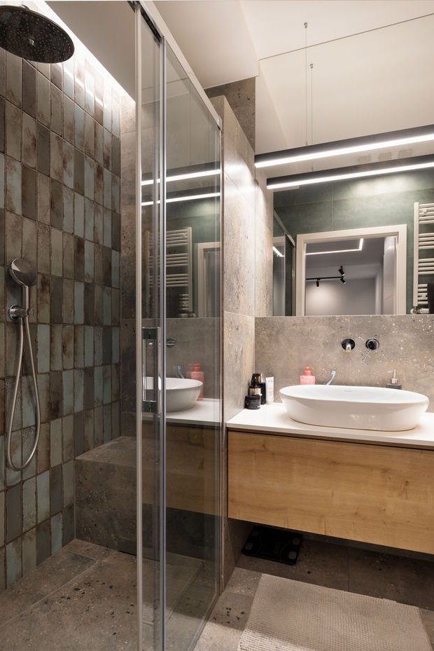 Łazienka z dużą kabiną prysznicową, baterie podtynkowe.