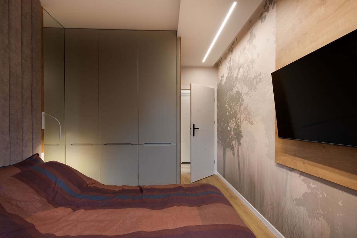 Sypialnia z dużą szafą, dwuosobowym łóżkiem sypialnianym, szafkami nocnymi, półkami i fototapetą na jednej ścianie.