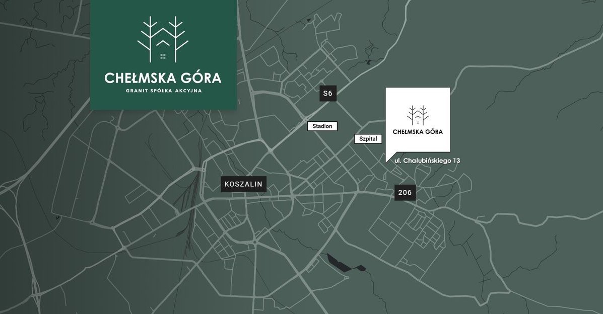 Osiedle CHEŁMSKA GÓRA zlokalizowane jest na skrzyżowaniu ulic Chałubińskiego i Leśnej w Koszalinie. W I etapie wybudowane zostaną 10² mieszkania o zróżnicowanym metrażu: od 38,19m² do 115,81m², rozmieszczone na sześciu kondygnacjach nowoczesnego, wyposażonego w windę bloku, z czego pierwsza z nich pełnić będzie funkcję hali garażowej. Do dyspozycji mieszkańców będą również naziemne miejsca postojowe oraz komórki lokatorskie. Doskonałe położenie inwestycji, wysoki standard wykończenia oraz komfort użytkowania sprawią, że będzie się tutaj żyło szczęśliwie i spokojnie.