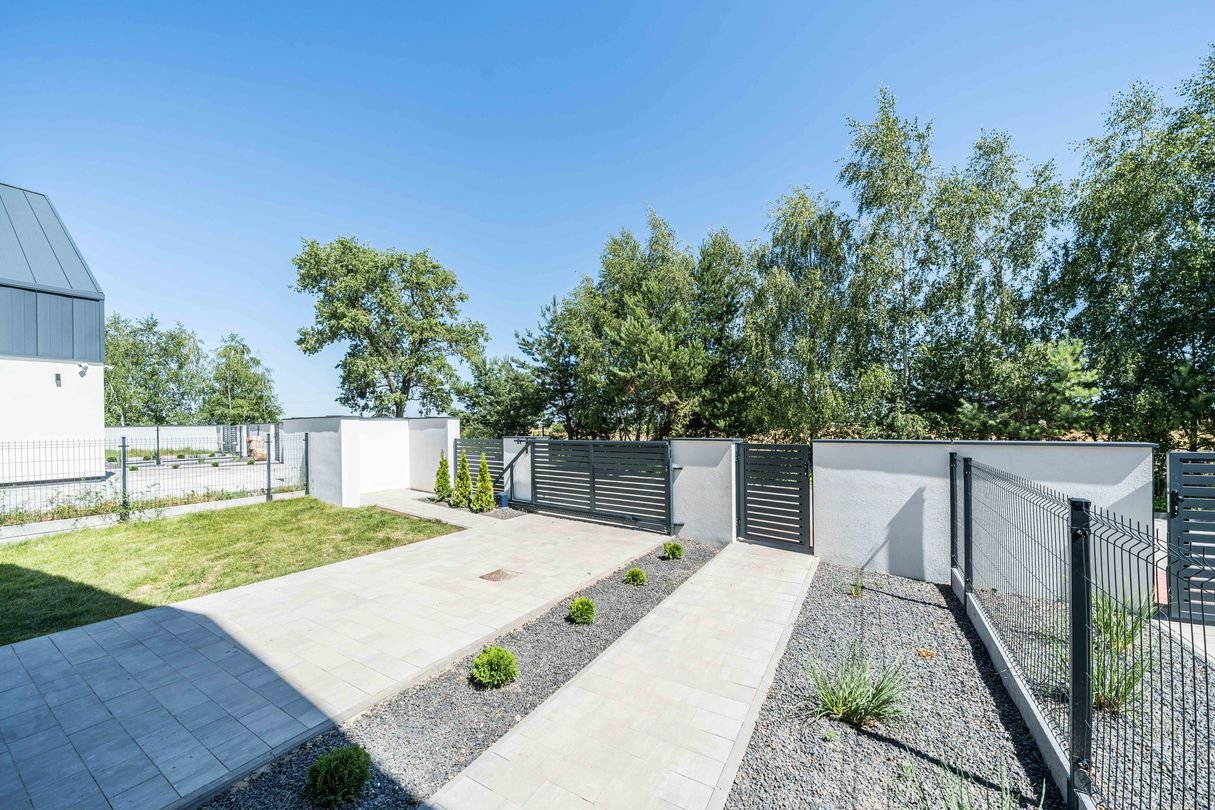 urządzony ogród od strony frontowej budynku, podkreślający elegancję i wyjątkowość osiedla: w przestrzeni pomiędzy podejściem a podjazdem zostały wysypane kamyki ozdobne wraz z nasadzeniem, w strefie przy sąsiedzkiej zieleń stanowi okazała trawa pampasowa a przy ogrodzeniu frontowym zostały posadzone tuje