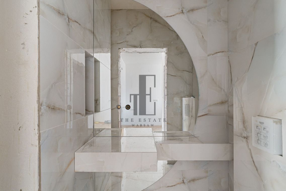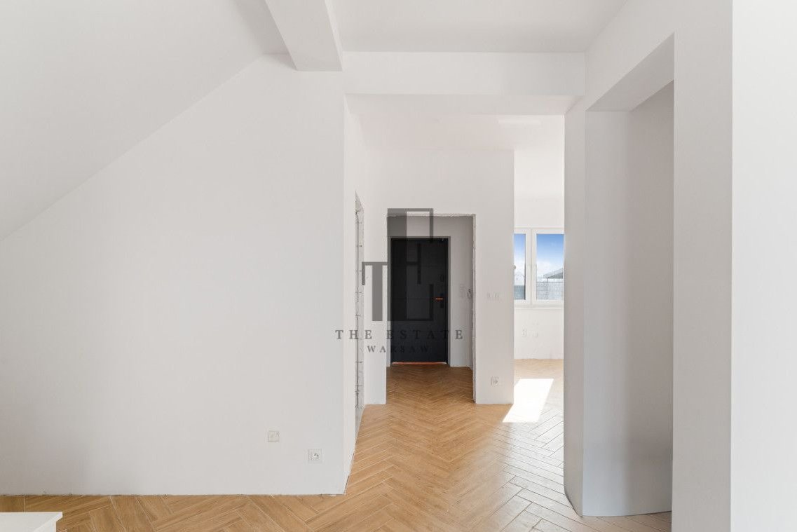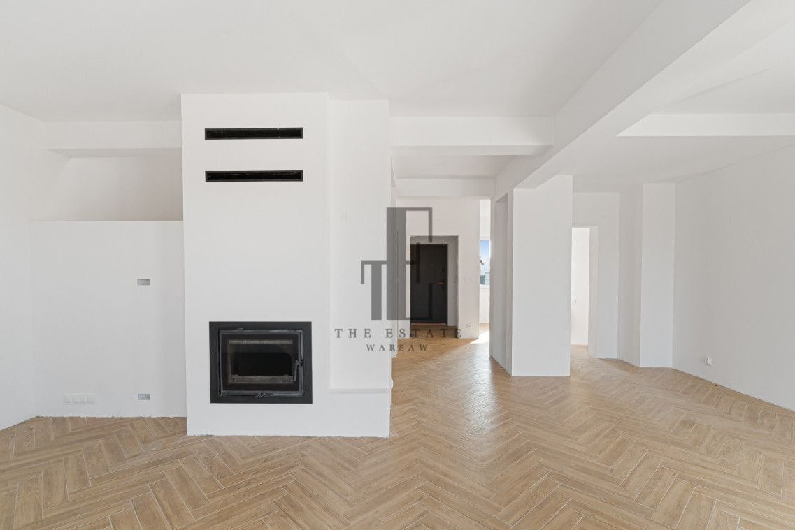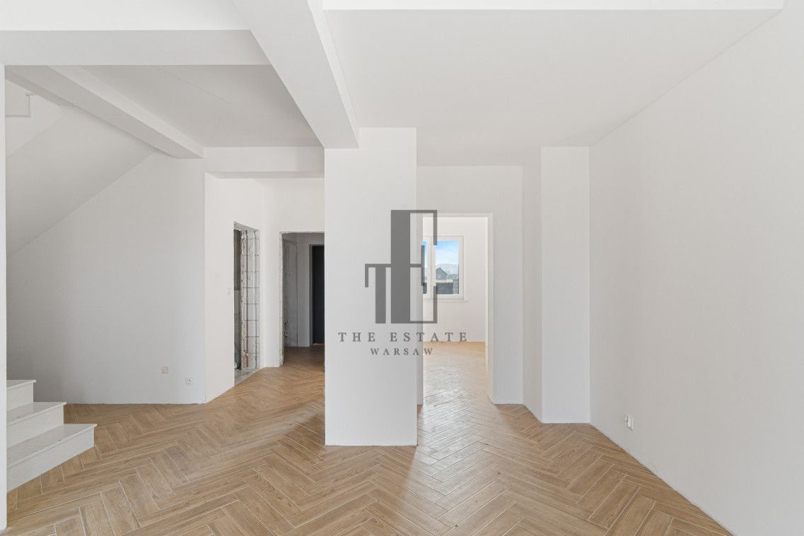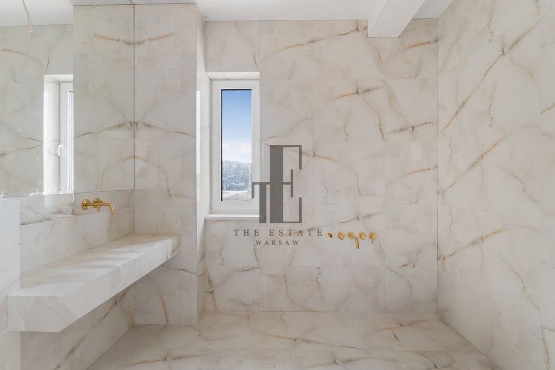 Na piętrze znajdują się: sypialnia główna z garderobą i wyjściem na taras, dwa dodatkowe pokoje oraz pokój kąpielowy z miejscem na wannę i prysznic z odpływem liniowym. Podłogi na obu kondygnacjach wykończone gresem w jodełkę, a schody z białego konglomeratu nadają wnętrzu elegancji.