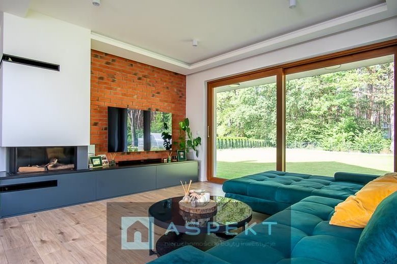 - przestronny salon z kominkiem i dużymi przeszkleniami z widokiem na las