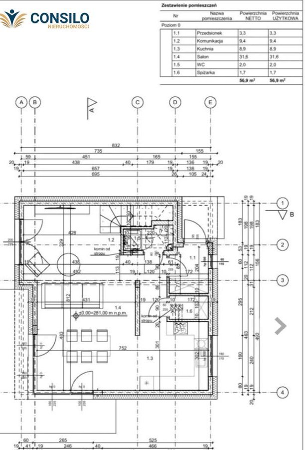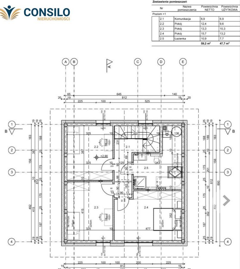 Na powierzchni użytkowej 104 m2 uzyskano funkcjonalny rozkład pomieszczeń: