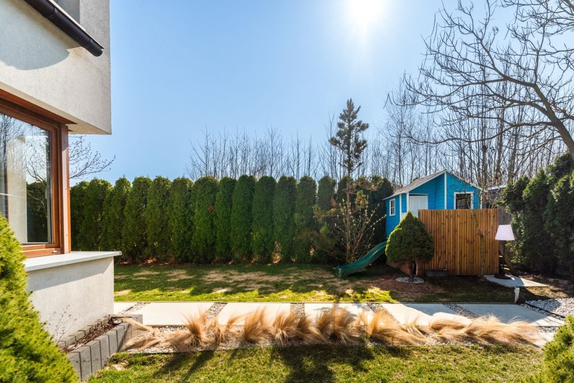 Dom charakteryzuje się ekspozycją na trzy strony świata, co gwarantuje idealne doświetlenie o każdej porze dnia. Co istotne - brak okien wychodzących na ulicę zapewnia absolutną prywatność i intymność w domowym zaciszu.