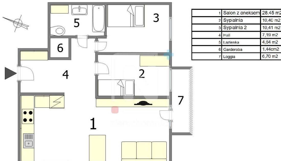 Funkcjonalny układ: przestronny salon z aneksem kuchennym, dwie sypialnie, łazienka oraz praktyczna garderoba