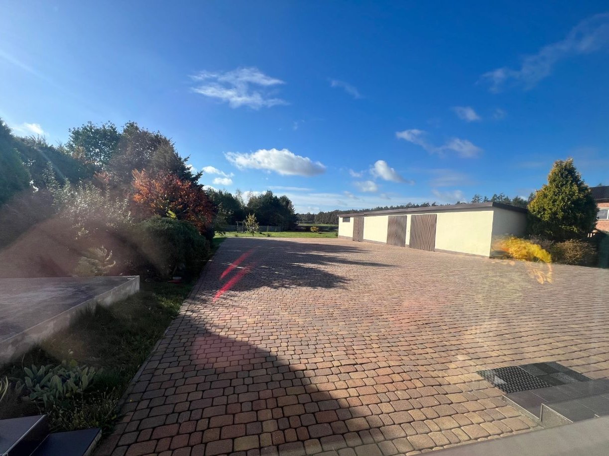 Dach kryty blachodachówką, ocieplony wełną, ogrzewanie piecem zasypowym, na podłogach panele, tynki na ściankach, łazienki w glazurach. Balkon, duży taras. Wolnostojące trzy duże garaże, plac przy domy i garażach wybrukowany.