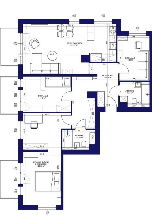 Składa się z salonu z aneksem kuchennym, 3 komfortowych pokoi, gabinetu, dwóch łazienek i przedpokoju oraz 3 balkonów.