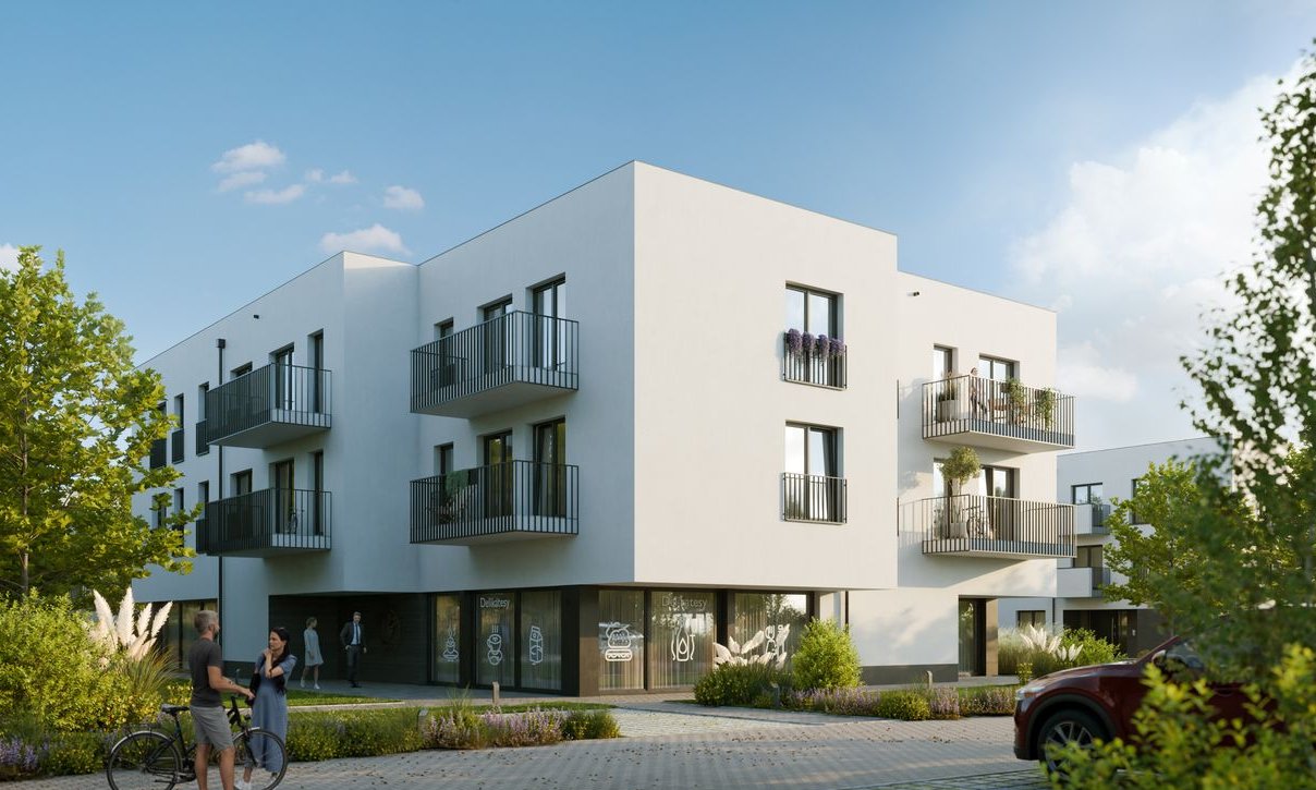 W budynku B dostępnych jest łącznie 8 lokali mieszkalnych dwupokojowych o powierzchni od 54 do 65 m2 oraz lokal usługowy o powierzchni 218 m2.