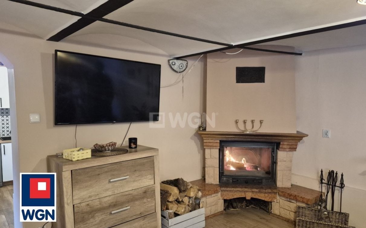 W salonie znajduje się klimatyczny kominek. Na piętrze domu są dwie przytulne sypialnie.