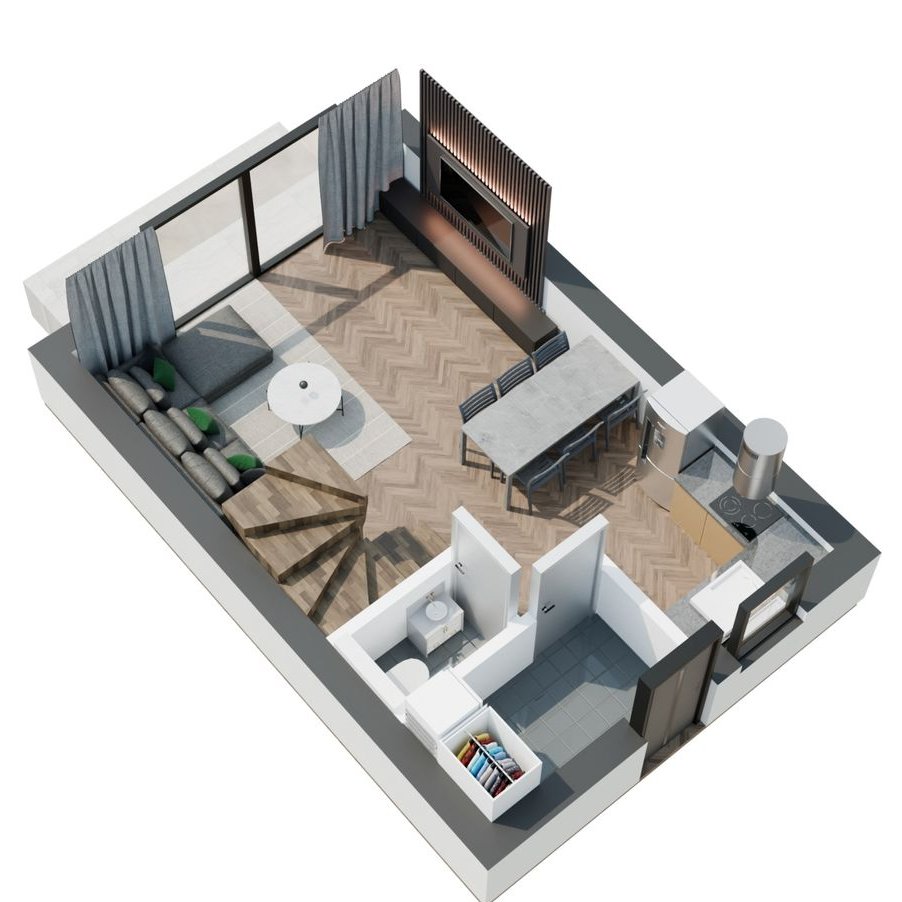 Parter stanowi przestronny salon połączony z jasnym aneksem kuchennym. Z tego pomieszczenia prowadzą duże, przesuwne drzwi balkonowe, które zapewniają doskonałe doświetlenie wnętrza oraz bezpośrednie wyjście na słoneczny ogród. Na parterze znajduje się również toaleta oraz praktyczny, wyodrębniony przedsionek.