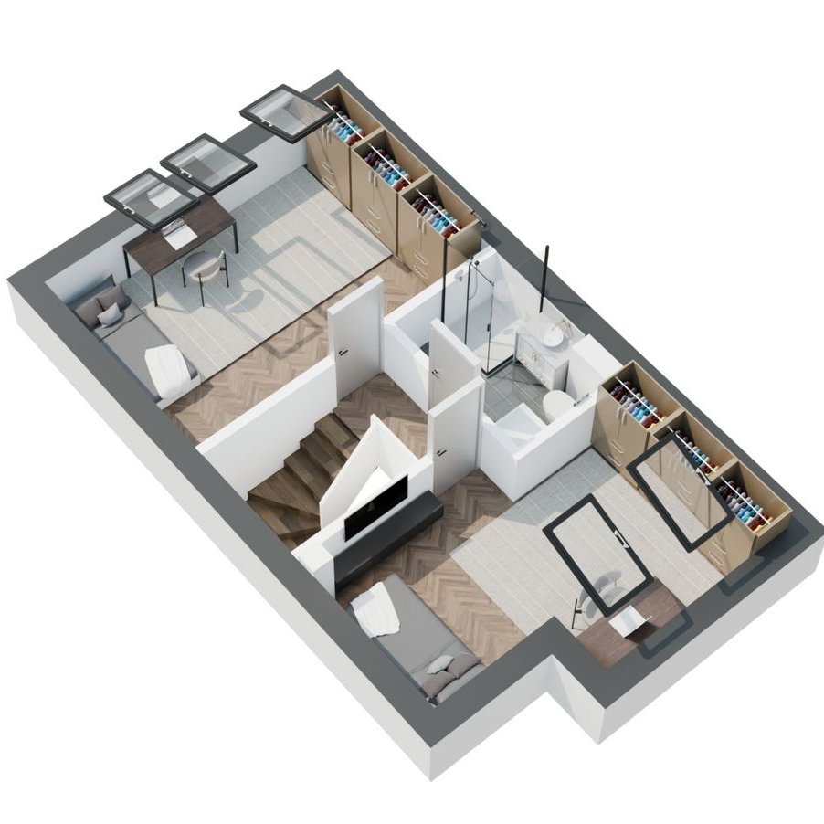 Każdy dom w inwestycji Południowa Aleja jest trzypoziomowy ( parter, piętro i poddasze użytkowe -mieszkalne). Łącznie można wydzielić aż 5 pokoi.