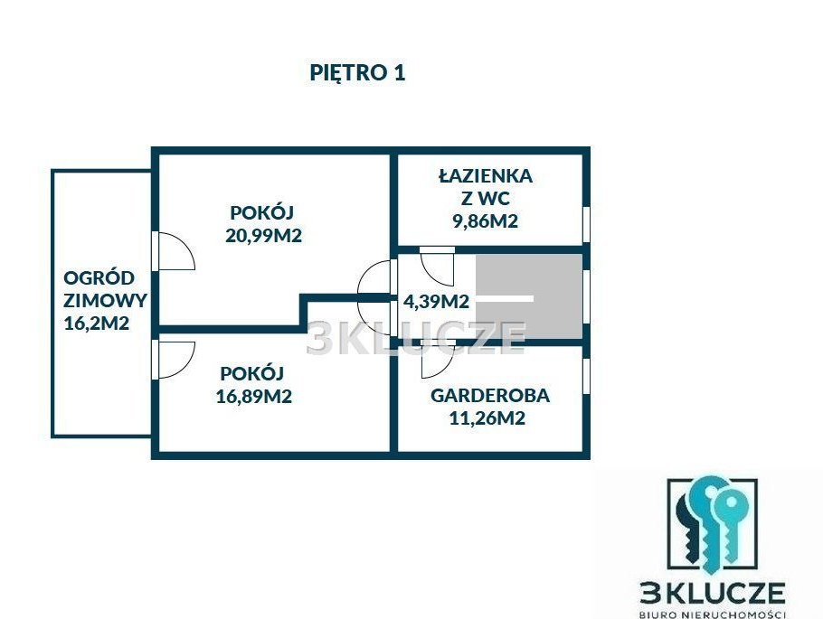 - 3 pokoje - dwie sypialnie o pow. 20,99 m2 oraz 16,89 m2 z wyjściem na ogród zimowy (o pow. 16,2 m2), sypialnia, która aktualnie pełni funkcję garderoby 11,26 m2