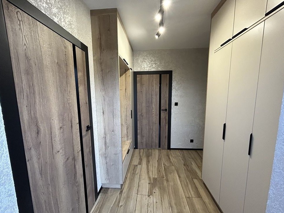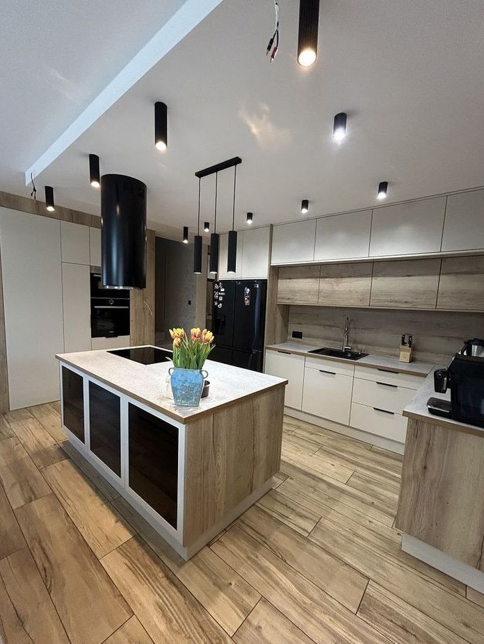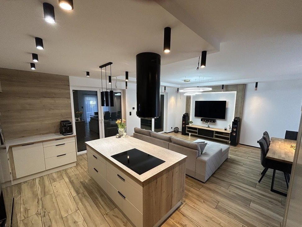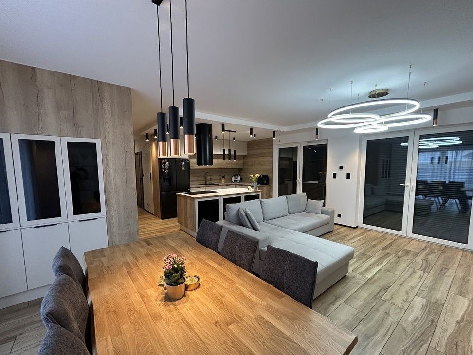 Parter stanowi przestronną, nowocześnie zaaranżowaną część dzienną. Sercem domu jest otwarty salon z aneksem kuchennym o imponującej powierzchni 40,5 m². Duże przeszklenia doskonale doświetlają wnętrze naturalnym światłem, a elektryczne rolety gwarantują wygodę i prywatność. Z salonu prowadzi bezpośrednie wyjście na zadaszony taras – naturalne przedłużenie strefy wypoczynkowej i idealne miejsce do relaksu o każdej porze roku. Część wypoczynkowa harmonijnie łączy się z jadalnią oraz elegancką kuchnią. Aneks został w pełni umeblowany w jasnej, ponadczasowej kolorystyce, z dbałością o detale i wysoką jakość wykończenia. Funkcjonalna zabudowa wraz z wyspą kuchenną oferuje dużą ilość miejsca do przechowywania i komfortową przestrzeń roboczą. Dodatkowym atutem jest wydzielona, praktyczna spiżarnia zlokalizowana pod schodami. Kuchnia wyposażona jest w wysokiej klasy sprzęt AGD. Na parterze znajduje się również nowoczesna łazienka z kabiną prysznicową, praktyczne pomieszczenie gospodarcze oraz przedpokój z pojemnymi szafami w zabudowie.