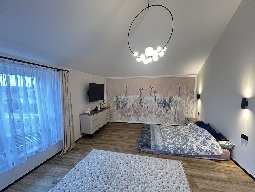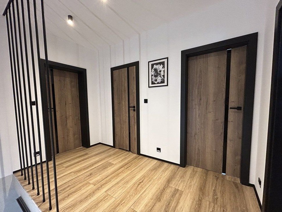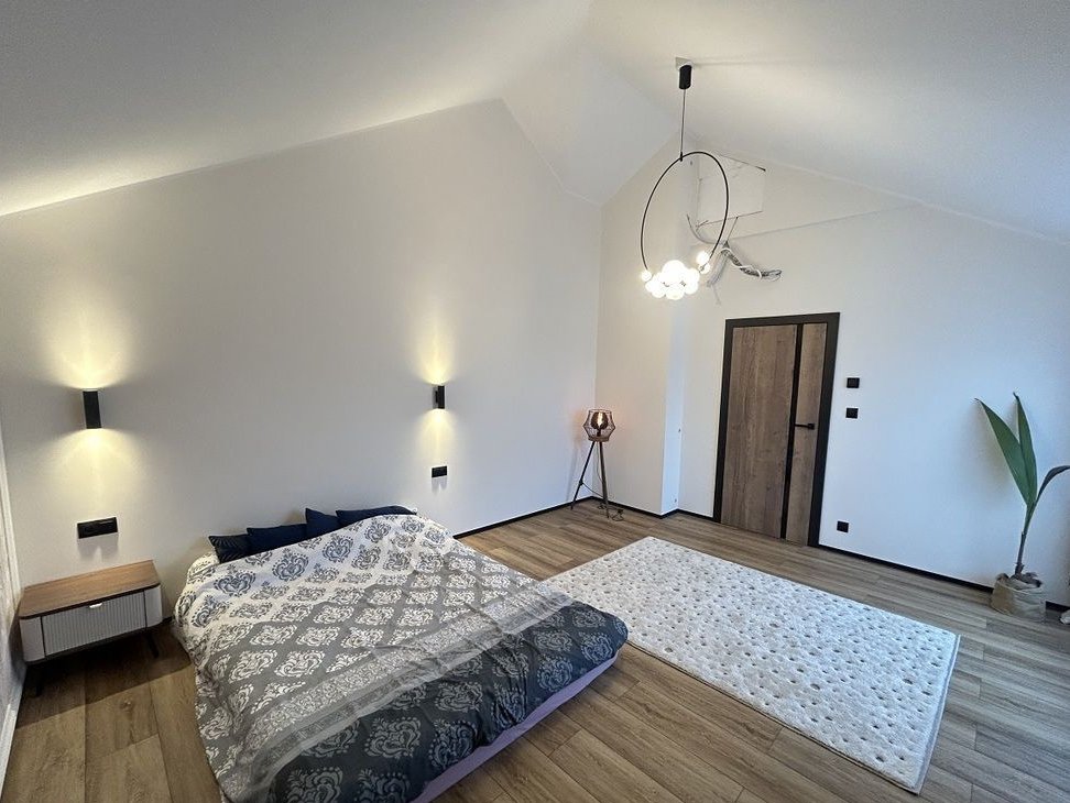 Piętro tworzy komfortową część sypialnianą. Znajdują się tu dwie ustawne sypialnie oraz elegancka, nowoczesna łazienka zaprojektowana z myślą o komforcie domowników. Jej centralnym punktem jest efektowna, wolnostojąca wanna z designerską baterią, tworząca prywatną strefę relaksu. Stylowa szafka z umywalką nablatową zapewnia wygodne miejsce do przechowywania. Dodatkowym atutem jest przestronna garderoba z oknem, która może pełnić swoją podstawową funkcję lub – dzięki odpowiedniej powierzchni i doświetleniu światłem dziennym – zostać z łatwością przekształcona w dodatkową sypialnię, gabinet bądź pokój dziecięcy, w zależności od potrzeb przyszłych Właścicieli.