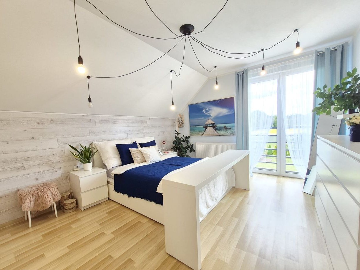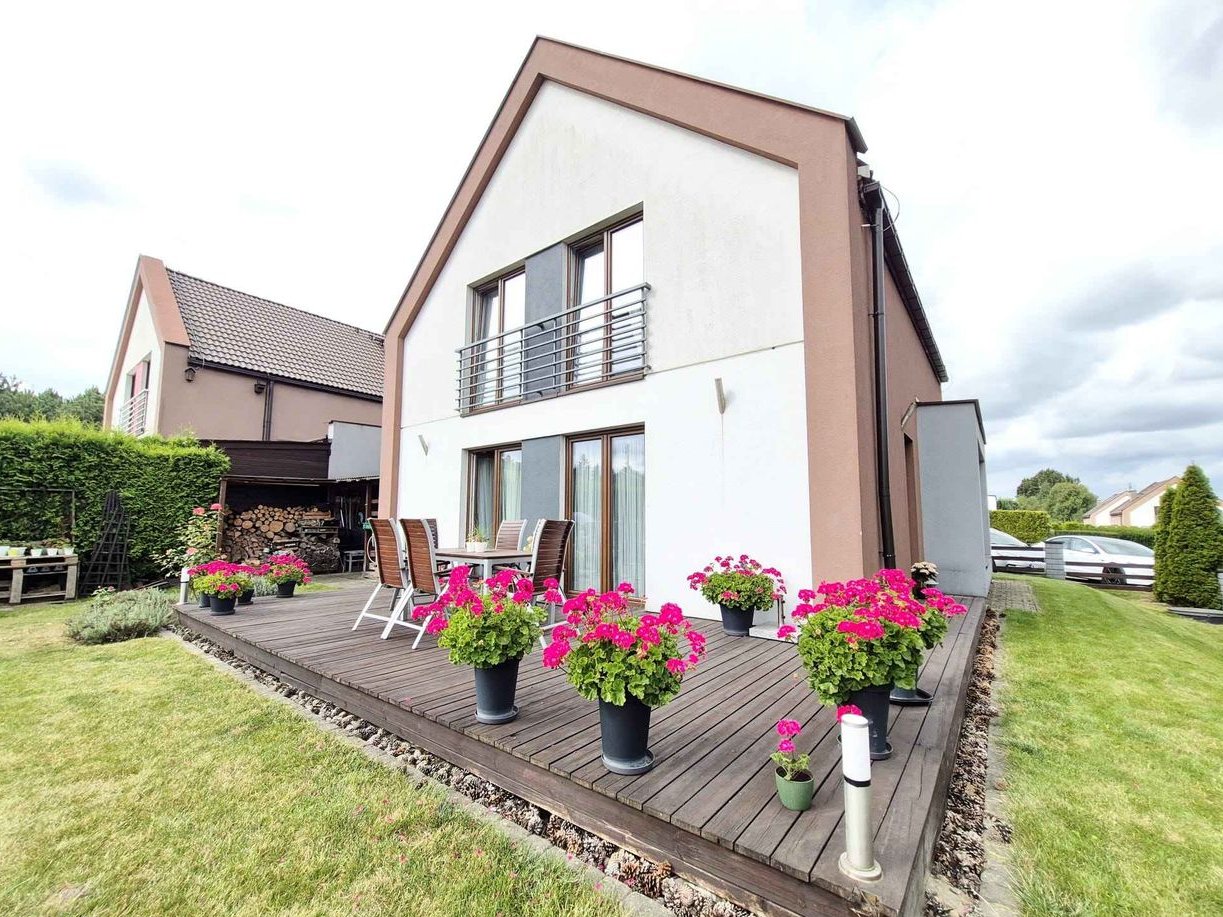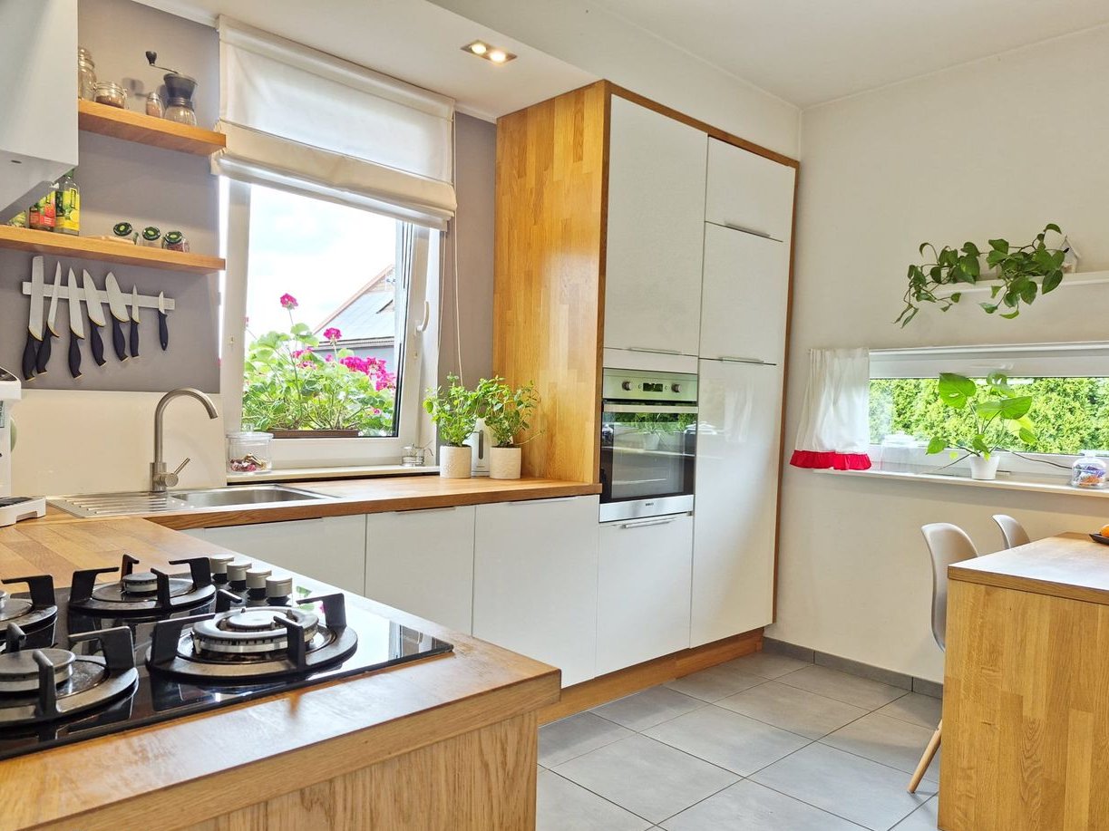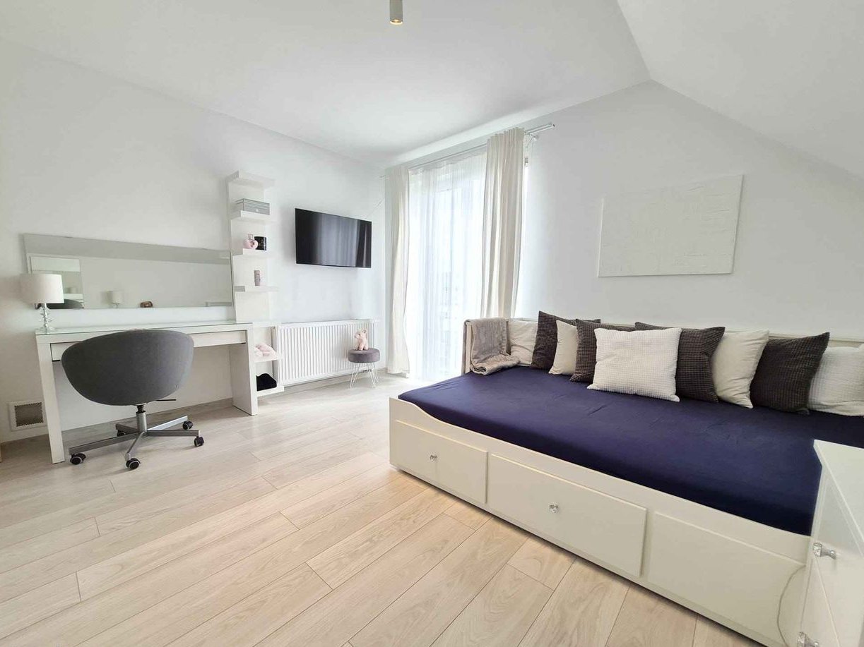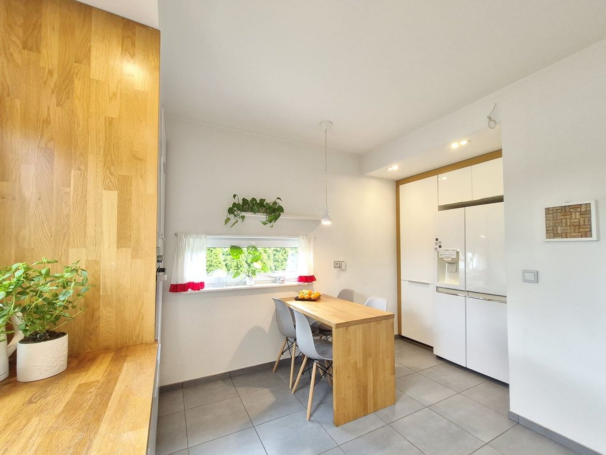 Cena domu zawiera również 2 szafy zabudowane oraz umeblowanie kuchni wraz z kuchnią gazową, kuchenką, zmywarką i lodówką. Pozostałe wyposażenie widoczne na zdjęciach za dodatkową opłatą.