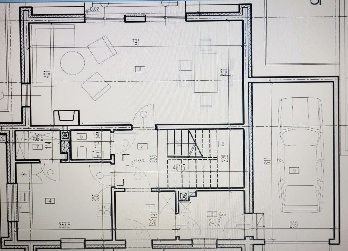 PARTER - wiatrołap, pomieszczenia gospodarcze z przejściem do garażu, ubikacja, kuchnia i duży salon, taras na zewnątrz oraz garaż