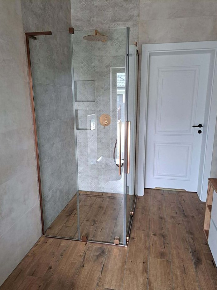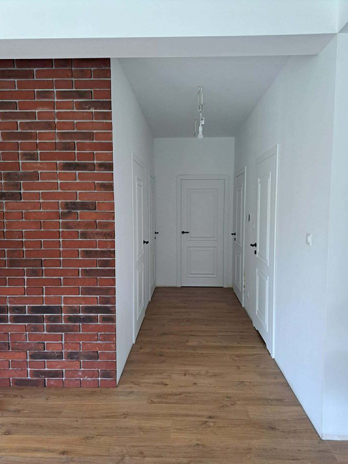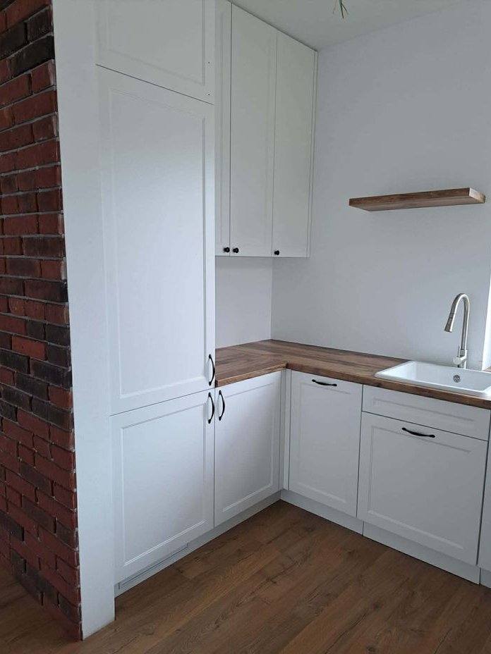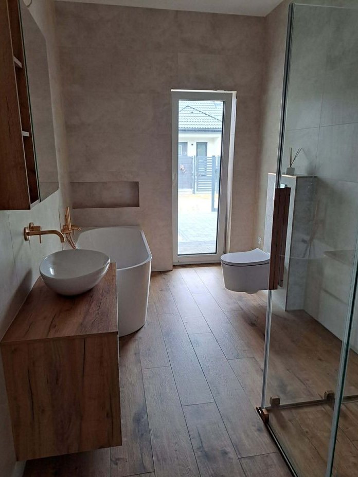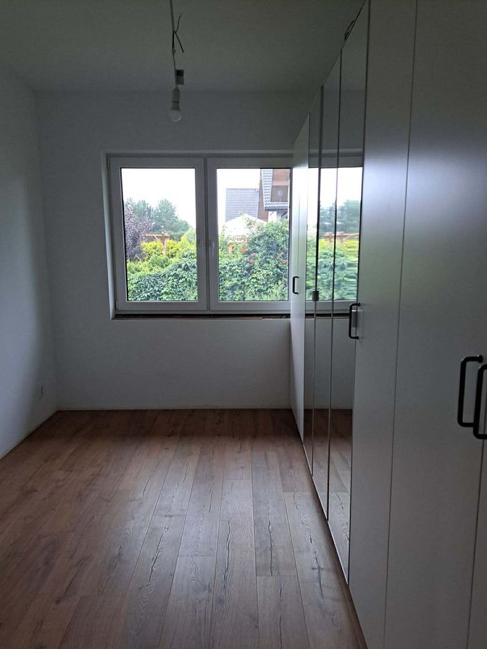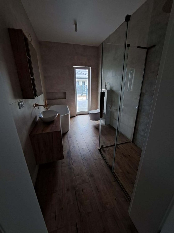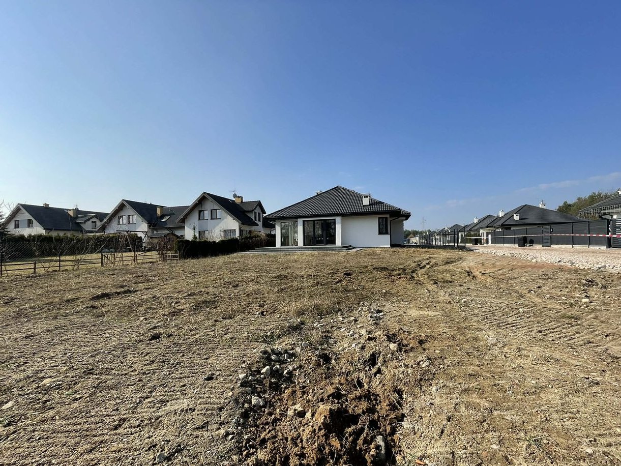 Układ pomieszczeń: Przestronna kuchnia z salonem i wyjściem na duży taras oraz ogród Łazienka z wanną i kabiną prysznicową (Radaway, armatura Tres), garderoba z pojemną szafą (ok. 4 m), dwa wygodne pokoje, przedsionek, pomieszczenie przechodnie (idealne na spiżarnię lub pralnię), garaż z ukończonym wyjściem na strych, kotłownia z nowoczesnymi filtrami, możliwość adaptacji poddasza na dodatkowy pokój.