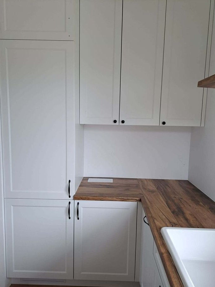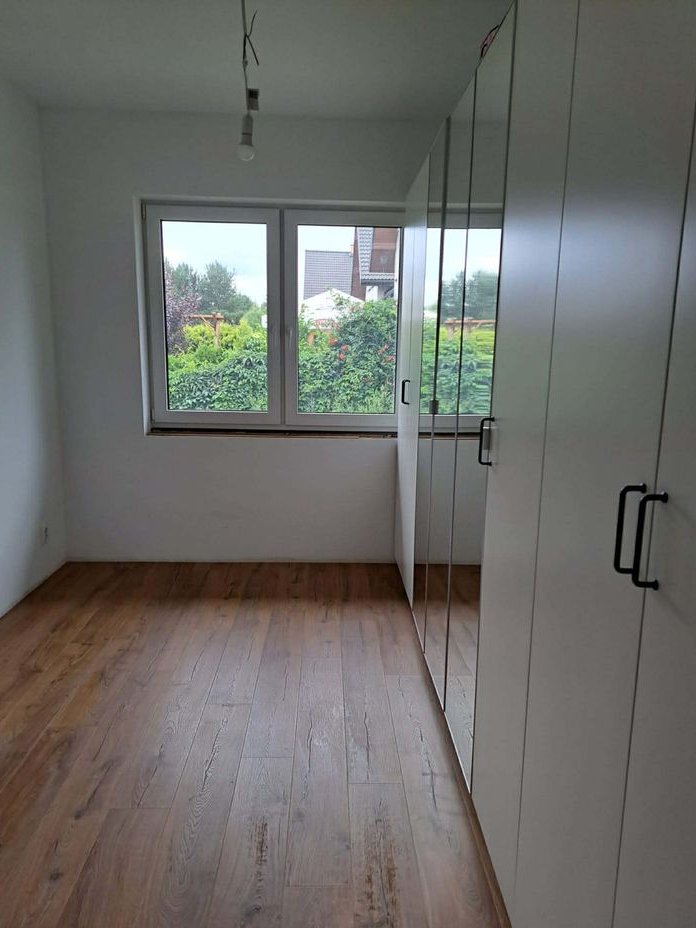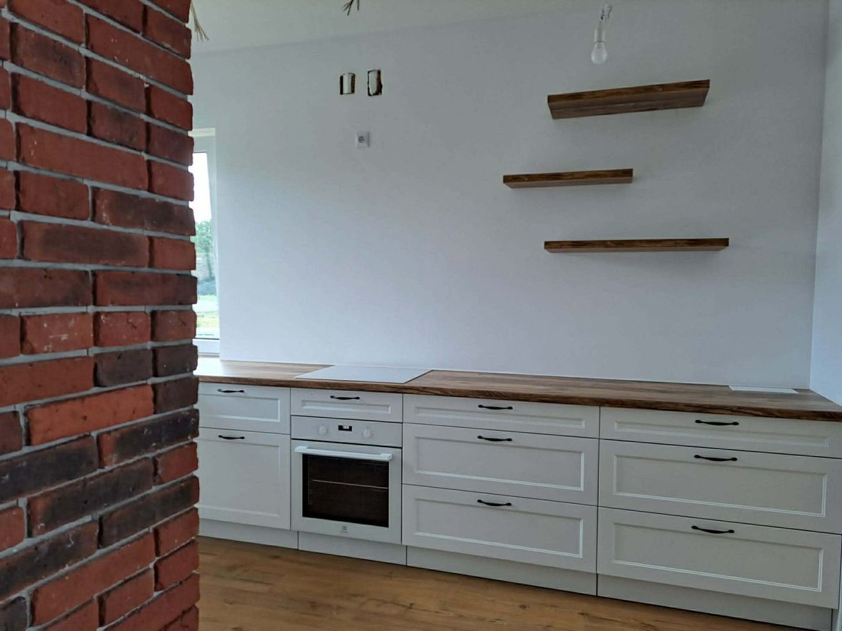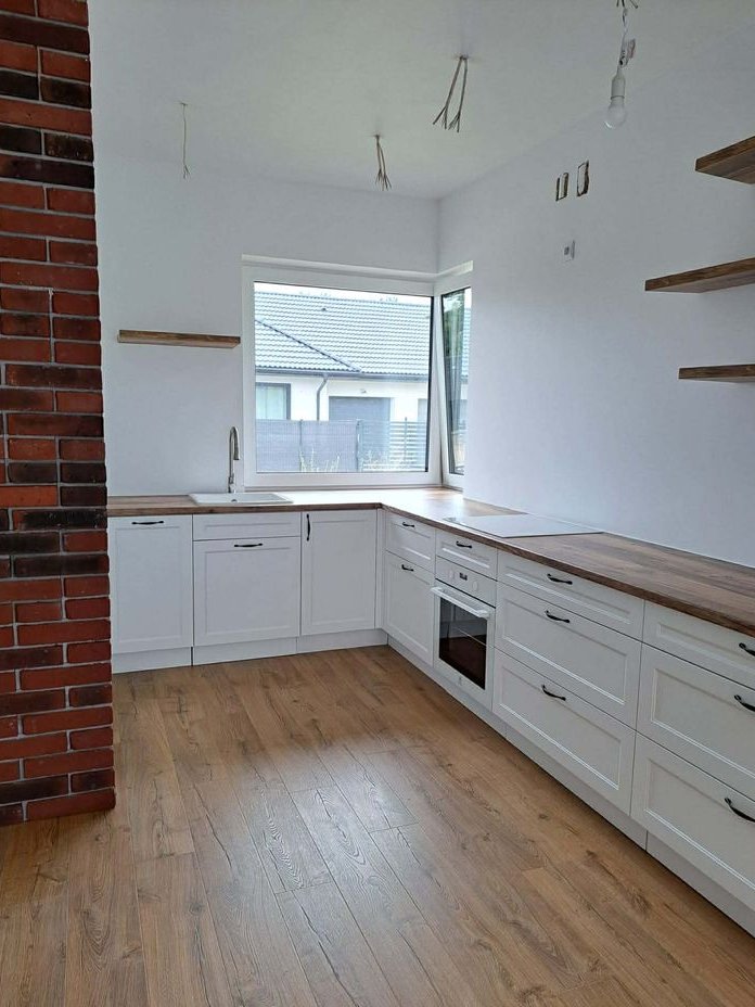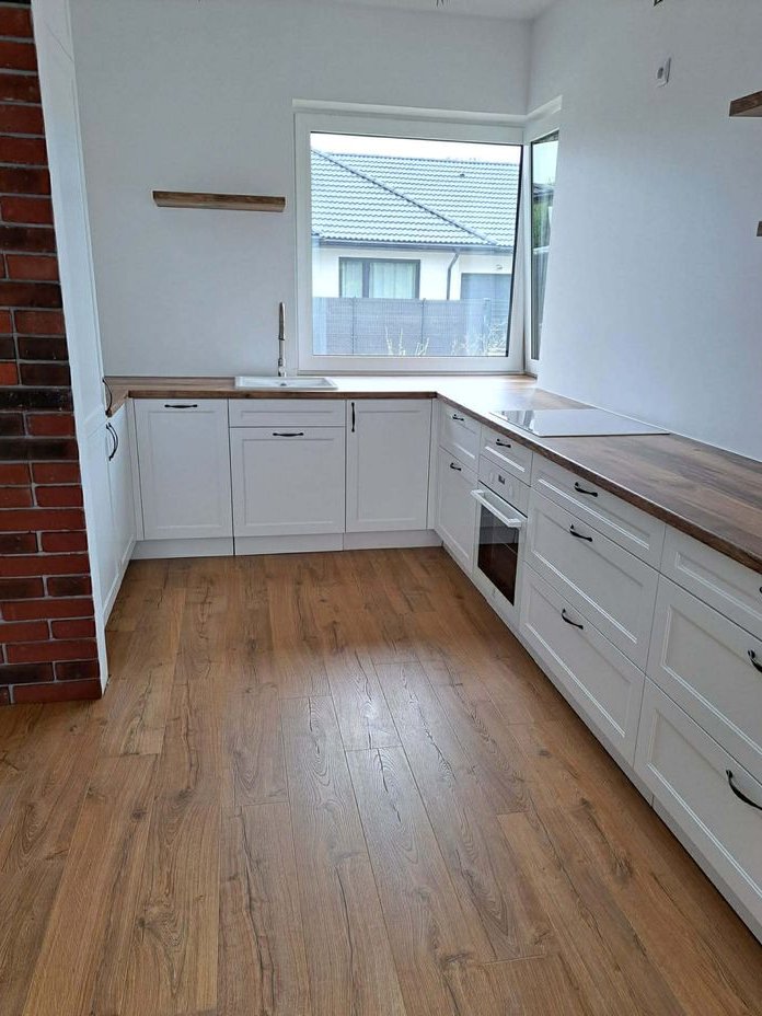 Standard wykończenia i wyposażenie: Ogrzewanie podłogowe we wszystkich pomieszczeniach parteru, nowoczesna kuchnia wykonania na wymiar: lodówka, zmywarka, piekarnik, płyta indukcyjna, okap systemy LeMans i Magic Corner, światła LED na czujnik ruchu, pojemne szafki z wysuwanymi cokołami, przygotowane miejsce na kominek w salonie. Panele laminowane w części mieszkalnej, płytki w łazience. Ściany i sufity w neutralnej bieli – gotowe do aranżacji.