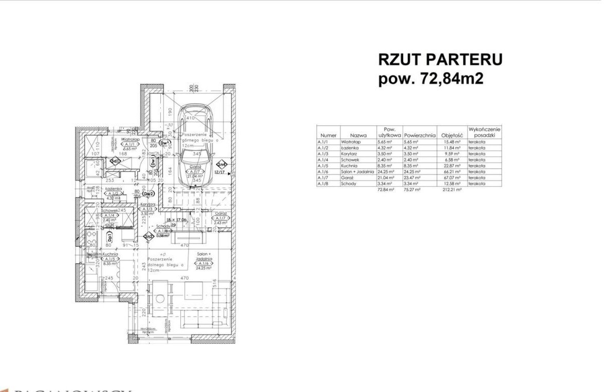 Parter: wiatrołap (5,65m2), łazienka (4,32m2), korytarz (3,50m2), schowek (2,4m2), kuchnia (8,35m2), salon + jadalnia (24,25m2), garaż (1,04m2), schody (3,34m2) - razem 72,84m2