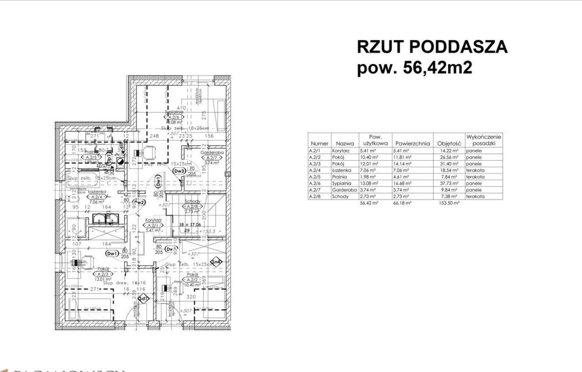 Poddasze: korytarz (5,41m2), pokój (10,4m2), pokój (12,01m2), łazienka (7,06m2), pralnia (1,98m2), sypialnia (13,08m2), garderoba (3,74m2), schody (2,73m2) - razem 56,42m2