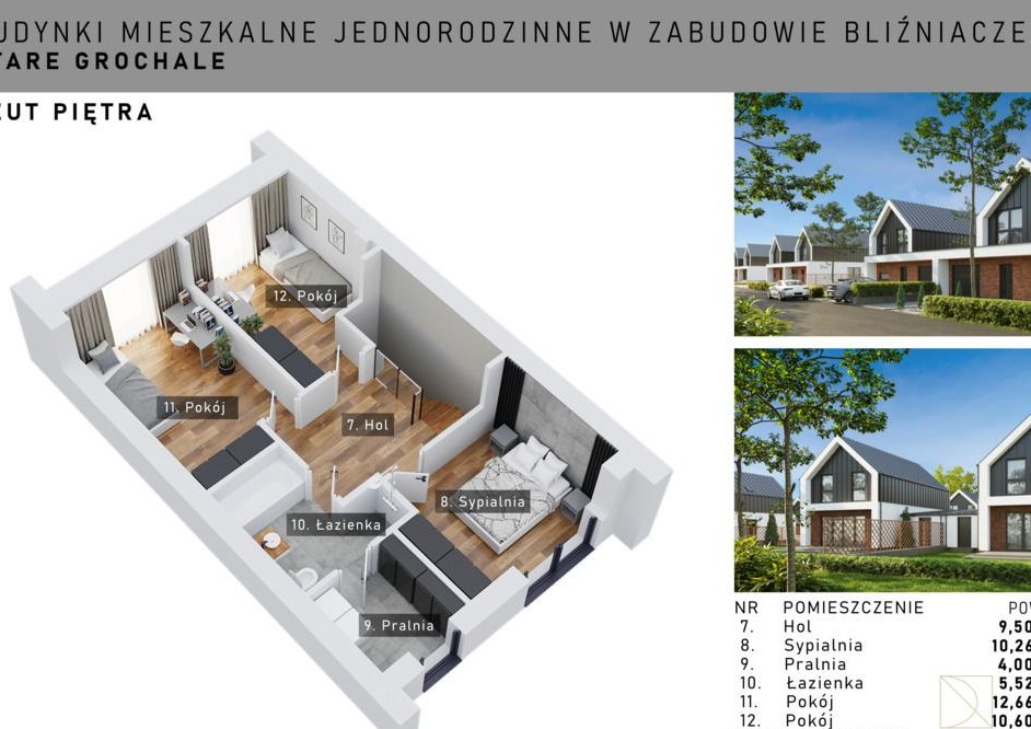 Na sprzedaż nowy dom w zabudowie bliźniaczej w Starych Grochalach (gm. Leoncin), przy Puszczy Kampinoskiej. Powierzchnia 136,58 m², działka 401 m², garaż + miejsce na podjeździe. Przemyślany układ: na parterze duża strefa dzienna 39,07 m², kuchnia ze spiżarnią, WC i pom. techniczne; na piętrze 3 pokoje, łazienka i pralnia. Ogrzewanie podłogowe (poza garażem), pompa ciepła z zasobnikiem, światłowód. Kameralny dojazd, wjazd na teren osiedla przez szlaban.