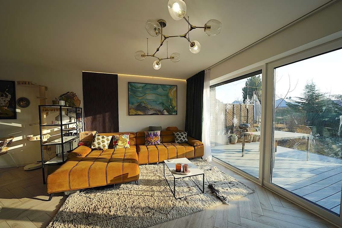 Salon z jadalnią to duża, otwarta przestrzeń z panoramicznym oknem i wyjściem na taras. Taras i ogród z ekspozycją południową.