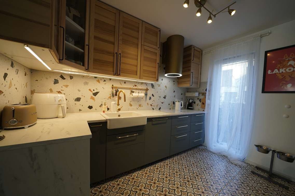 Kuchnia z meblami w zabudowie, część frontów z naturalnego drewna, w pełni wyposażona w sprzęt AGD.
