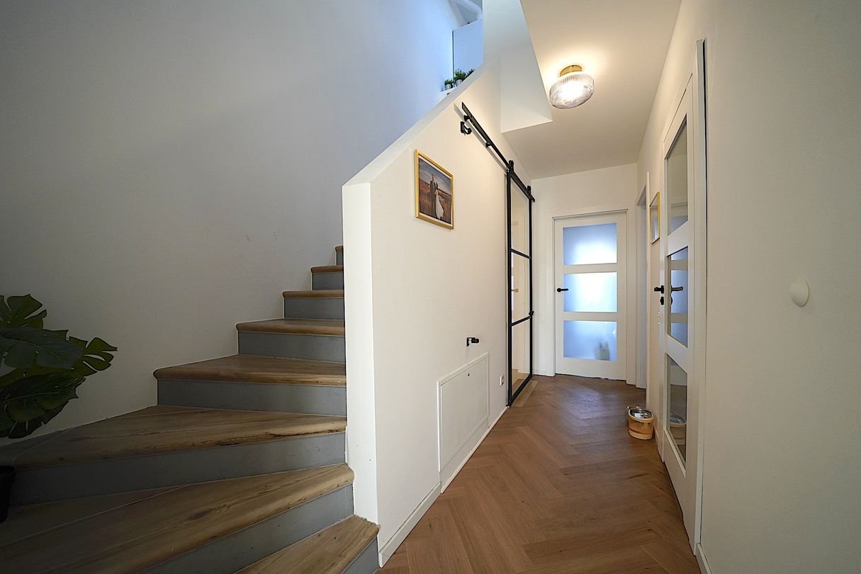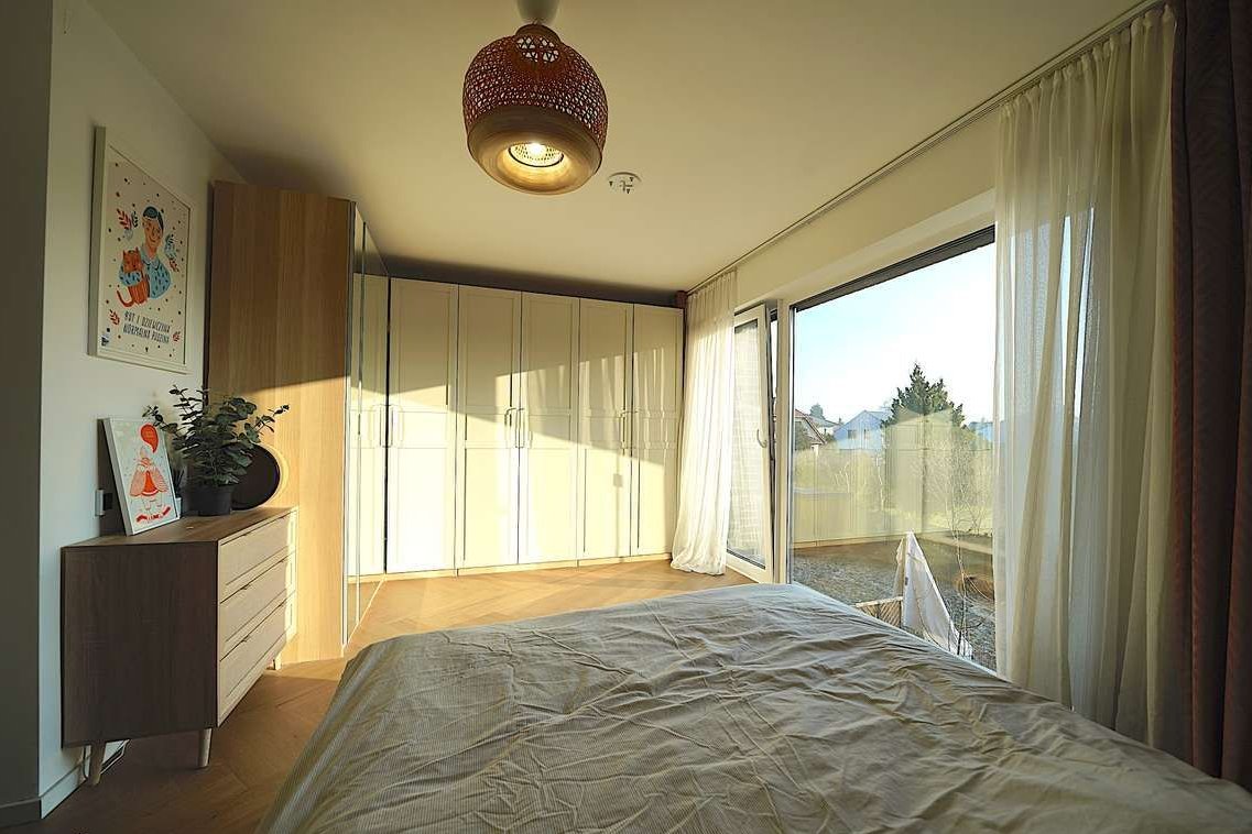 Na piętrze szklane drzwi przesuwne oddzielają klatkę schodową, wyciszając strefę dzienną od sypialni. Na piętrze są: duża, ustawna sypialnia małżeńska z szafami /garderobą w zabudowie, w sypialni jest panoramiczne okno bez szprosów; 2 dodatkowe pokoje, które mogą służyć jako pokoje dziecinne lub gabinet i sypialnia gościnna; pokój łazienkowy z prysznicem walk-in, z dwoma umywalkami dla niej i dla niego, WC z funkcją podgrzewania i mycia, z wolnostojącą wanną oraz szafkami w zabudowie. Na całej ścianie za wanną oryginalna, łazienkowa fototapeta.